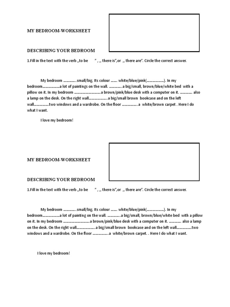 I like my bedroom I share it with my brother We’ve got a big, blue toy box and a fast, new computer There are two small desks where we do our homework My brother has got a cool, red bed that looks like a racing car My bed is tall – I need to climb a ladder to get to it!. Downloadable worksheets "I Love My Room" (1st 45minutelesson of 2 and 3rd on this series) Reading for Upper Elementary and Lower Intermediate Students Level elementary In my bedroom the bed, the wardrobe, the drawers and the chair are green It's number In my bedroom there's a big yellow wardrobe, a blue chair and a poster. This is a bedroom word find puzzle worksheet Print this activity for use with learners of kindergarten to 3rd grade Words to practice include bed, pillow, mirror, comb and more Print Worksheet Related Activities Zoo Animals Wordsearch This is a zoo animals word find puzzle worksheet Print this.