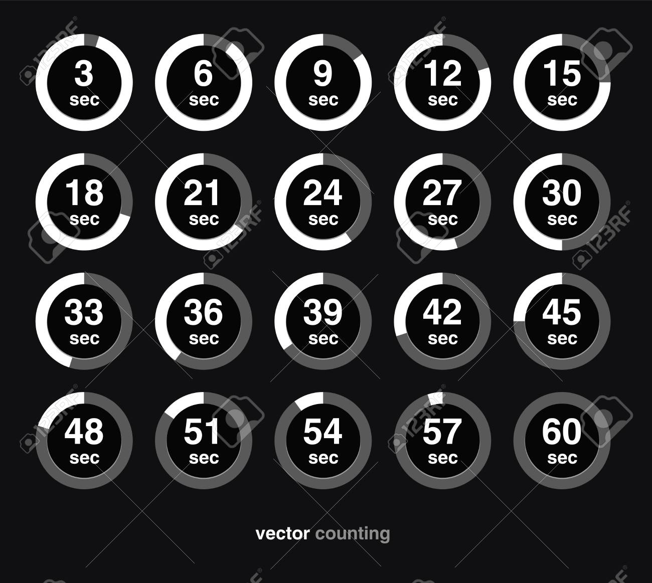 Vettoriale Raccolta Di Icone Vettoriali Con Orologio Conta Su Sfondo Nero Timespan E Di 3 Secondi O Minuti Image