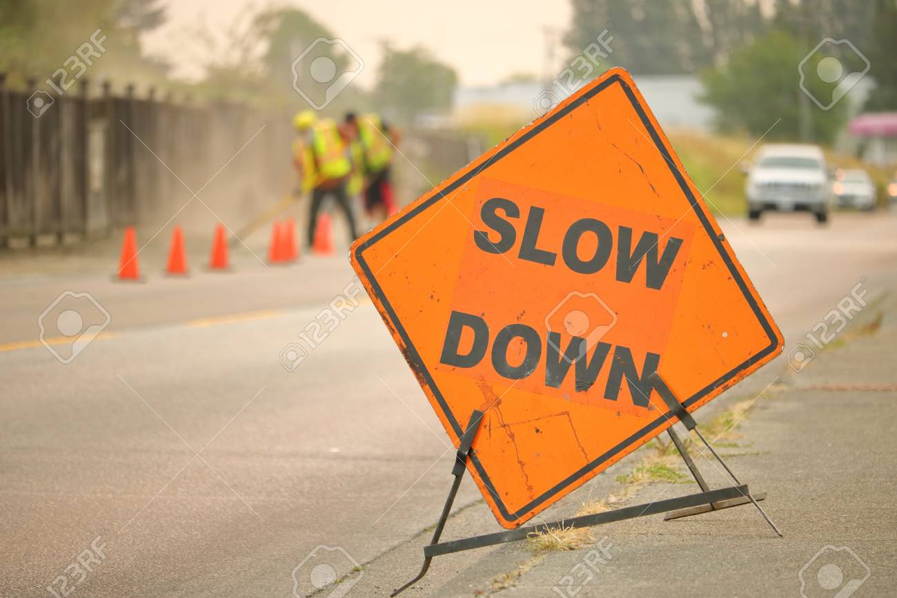 Immagini Stock Un Grande Cartello Inglese In Costruzione Ricorda Agli Automobilisti Di Rallentare Mentre E In Corso La Costruzione Di Strade Image