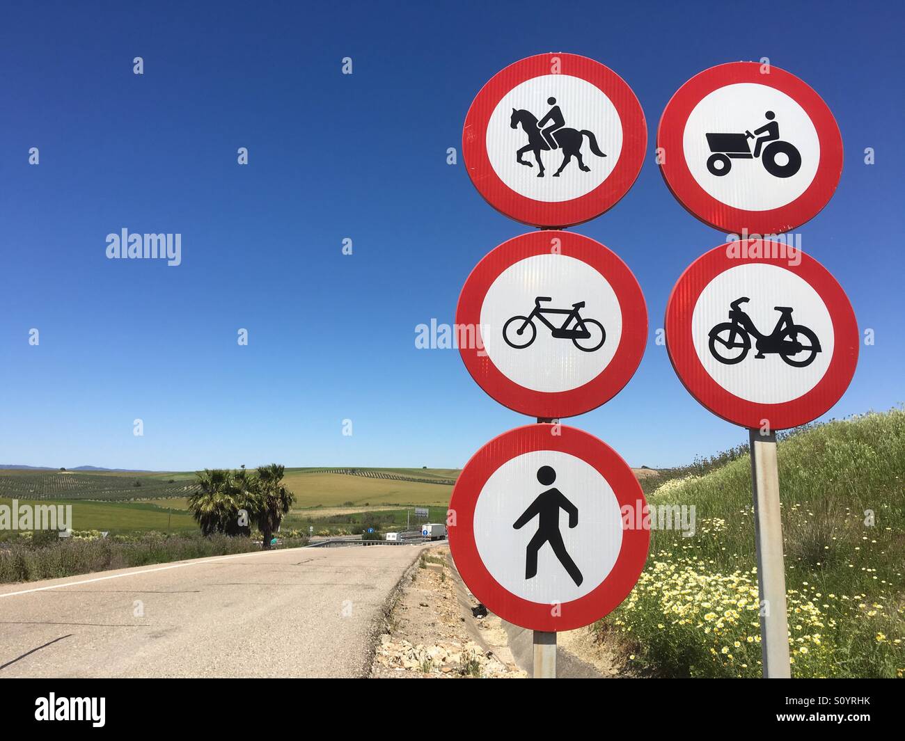 Indicazioni Stradali Su Spagnolo Svincolo Autostradale Divieto Di Cavalli Trattori Biciclette Ciclomotori E Pedoni Foto Stock Alamy