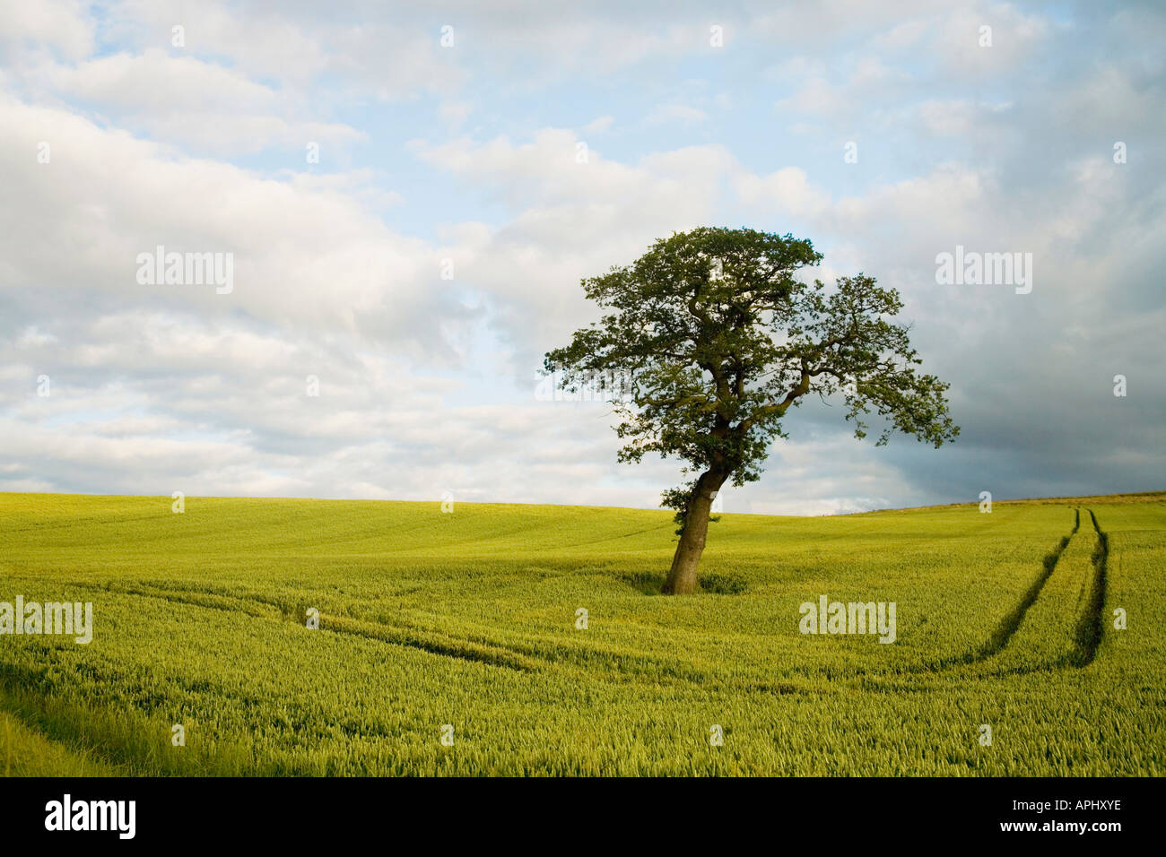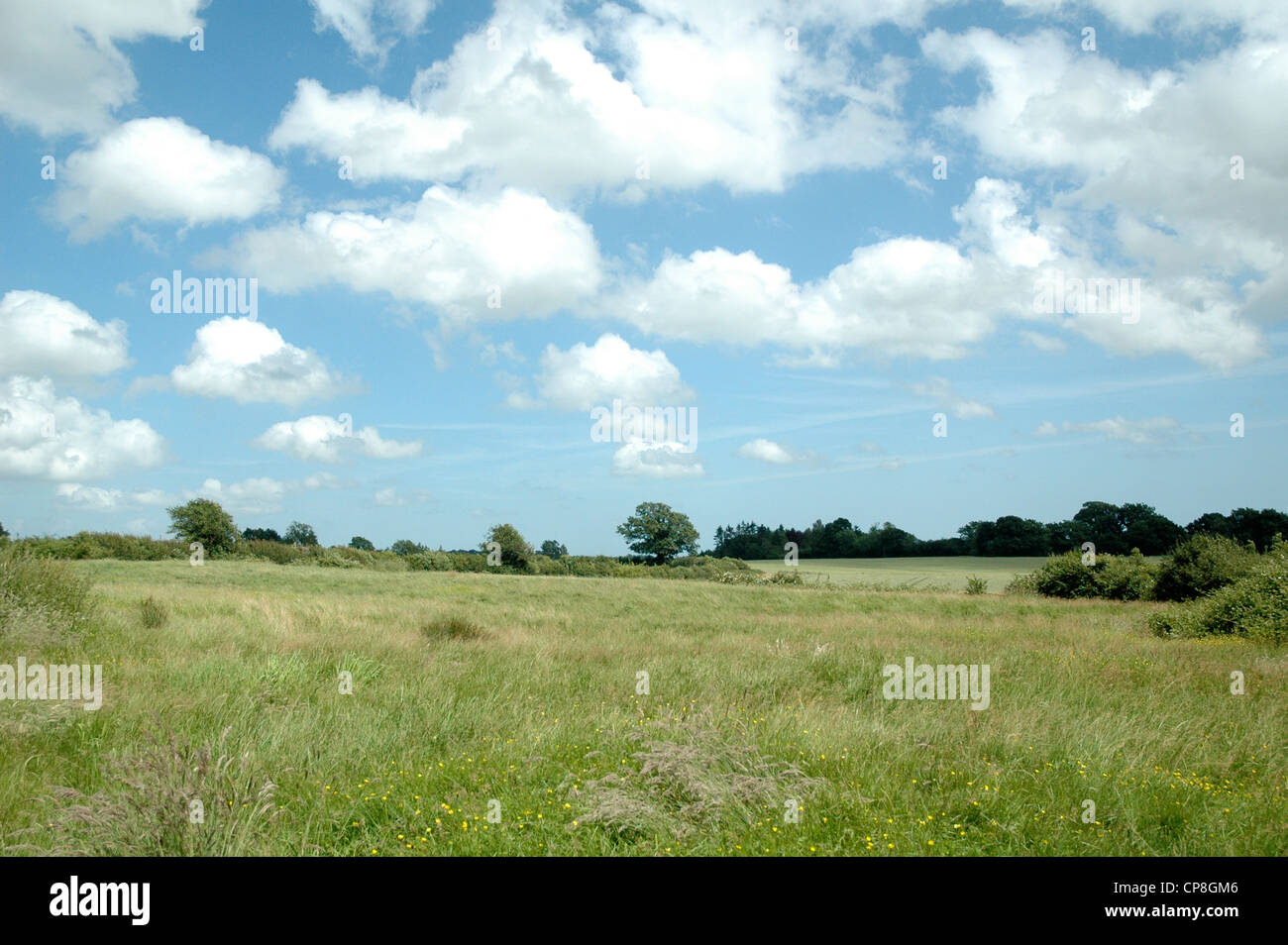 Inglese Campo Verde Prato E Quercia In Estate Il Sole Al Sole Con Cielo Blu E Nuvole Bianche Shropshire England Regno Unito Gb Foto Stock Alamy