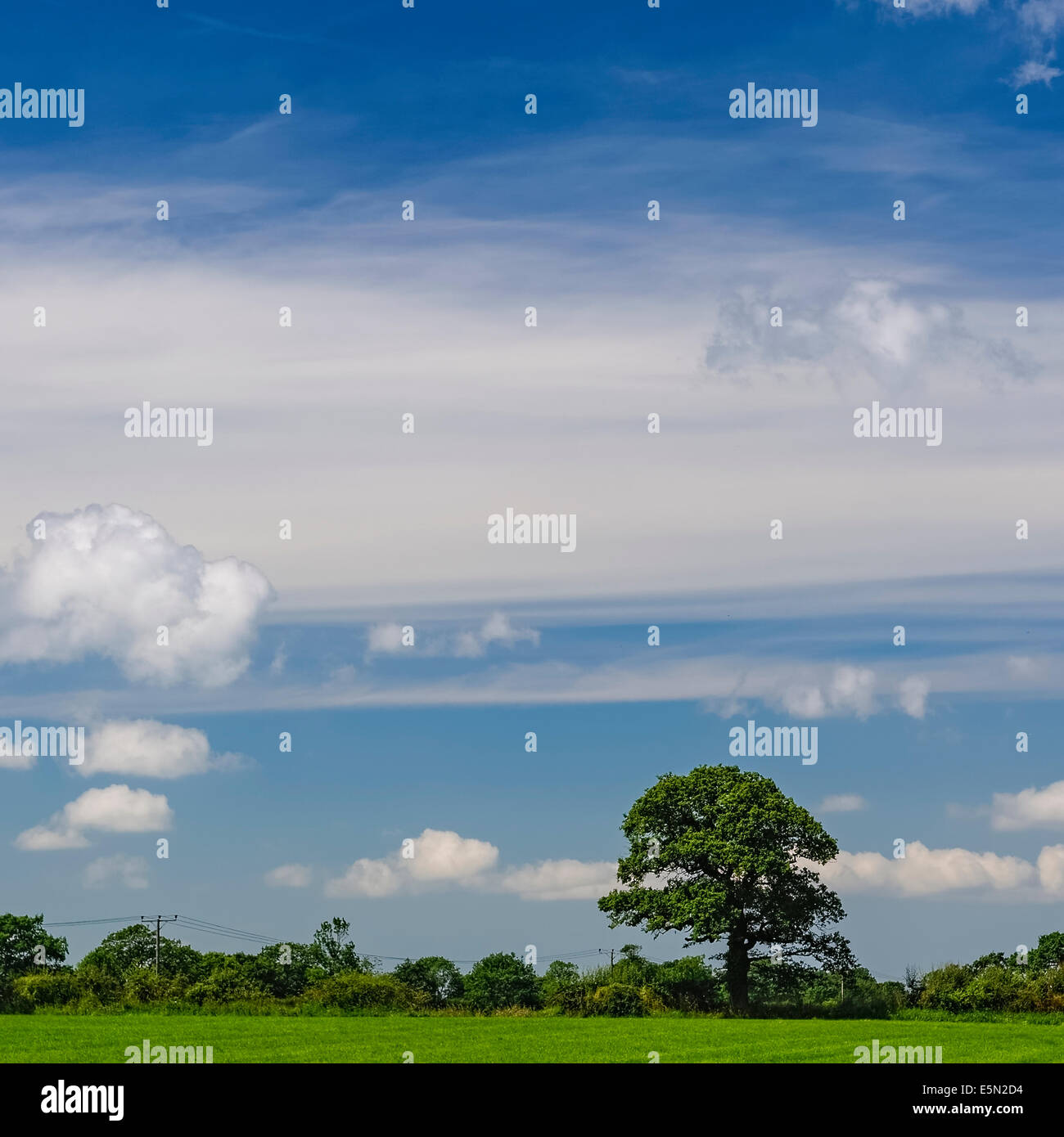 Unico Albero Nella Siepe In Inglese Campi Di Fili Telegrafici Il Cielo Blu Con Nuvole Bianche Formato Quadrato Foto Stock Alamy