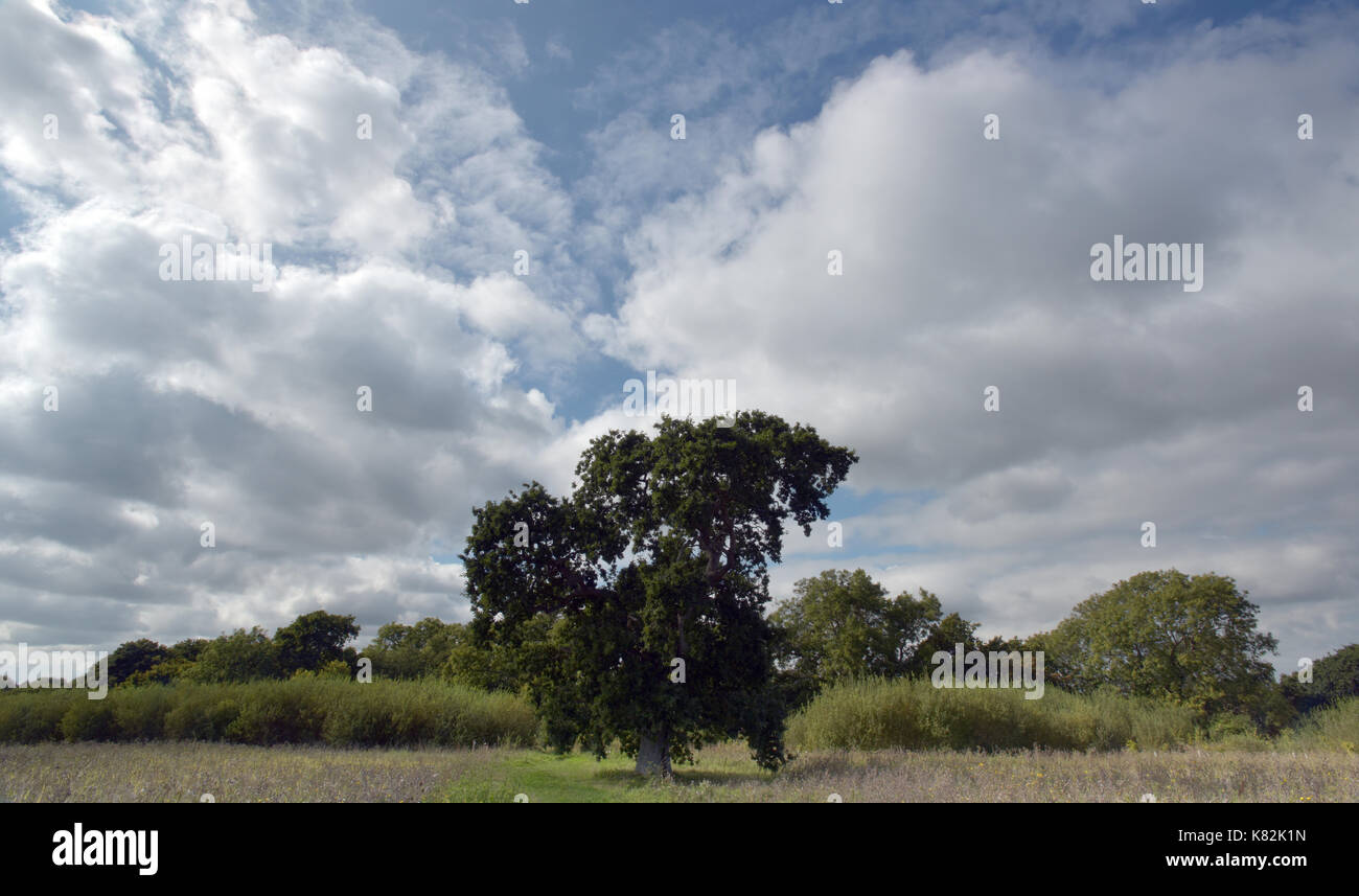 Un Inglese Di Quercia Grande Forma Matura E Alcuni Verdi Prati E Coltivazioni In Primo Piano Contro Un Cielo Blu Con Nuvole Estive Nella Stagione Autunnale Foto Stock Alamy