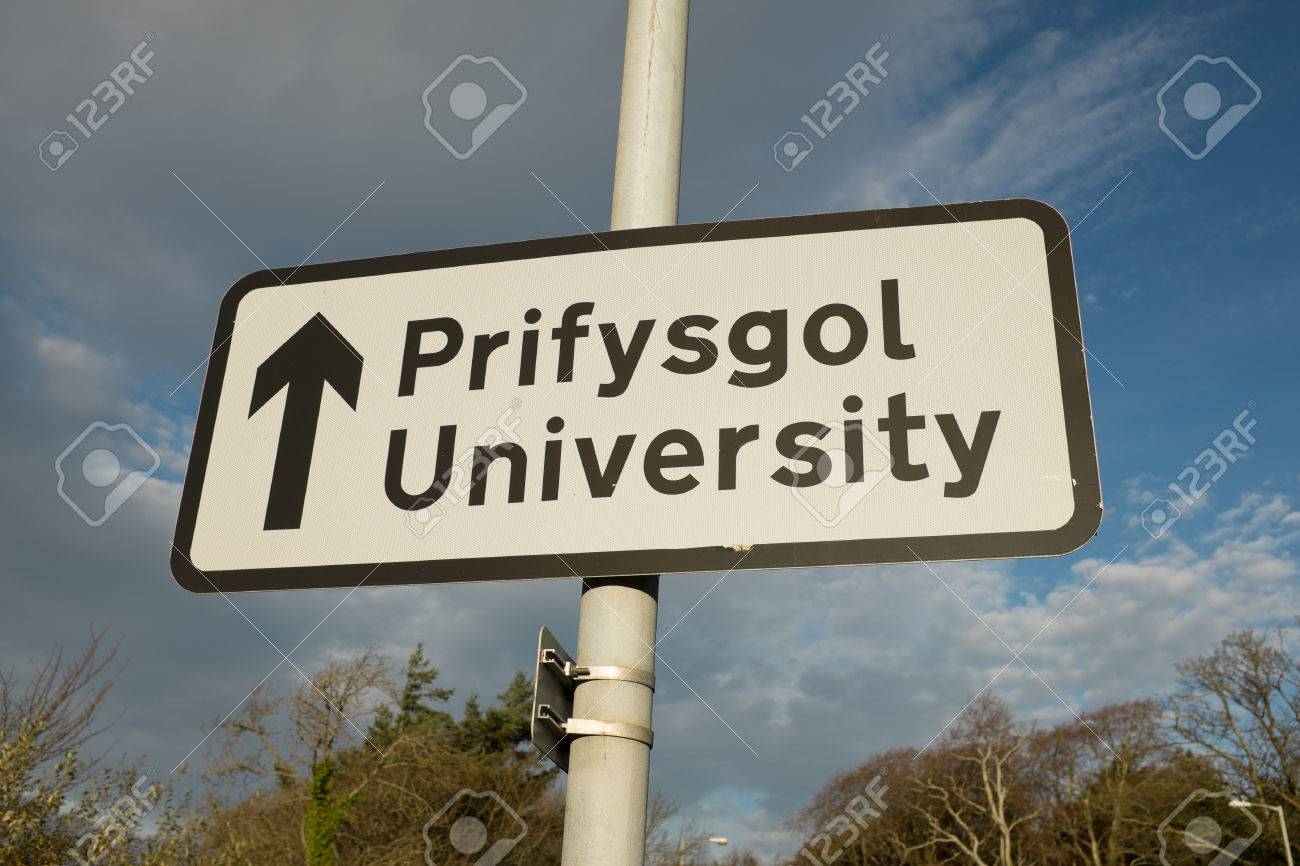 Immagini Stock Un Bilingue Inglese Direzionale Welsh Segno Universita Contro Un Cielo Blu Con Nuvole Image
