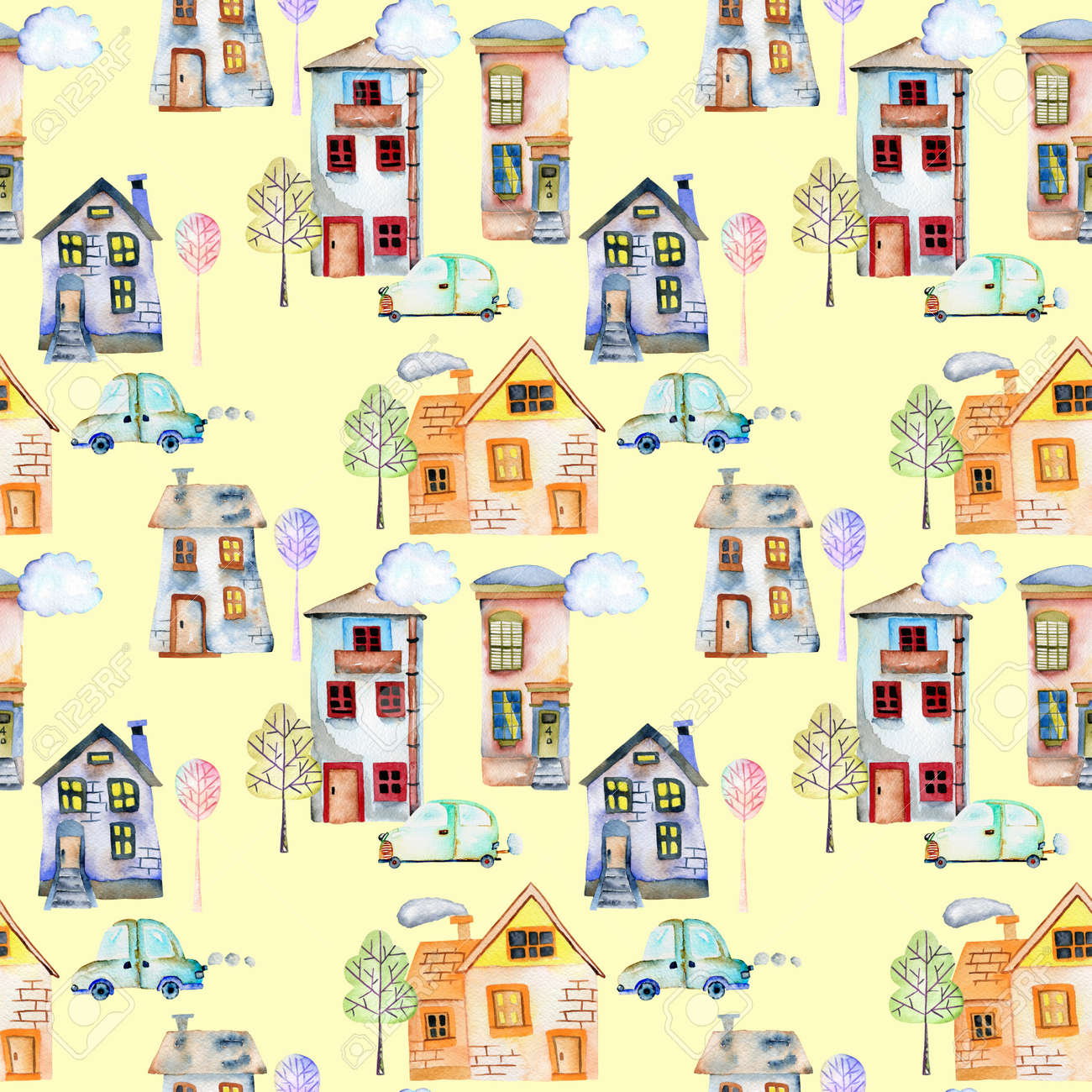 Immagini Stock Modello Senza Soluzione Di Continuita Con Carina Cartoon Acquarello Inglese Case Auto Alberi E Nuvole Dipinta A Mano Su Sfondo Giallo Image