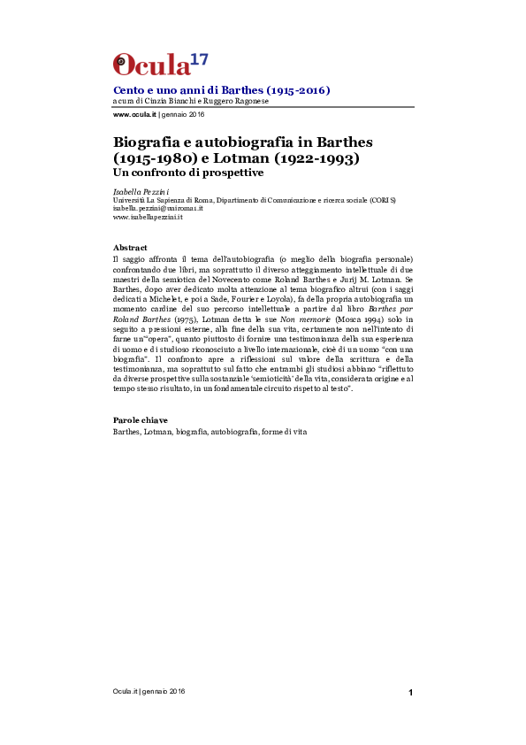 Pdf Biografia E Autobiografia In Barthes E Lotman Un Confronto Di Prospettive Isabella Pezzini Academia Edu