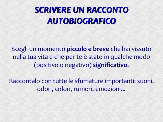 Autobiografia di Nelson Mandela Lungo cammino verso la libertà è un’autobiografia illuminante Nelson Mandela ci insegna che con la determinazione, il coraggio e la voglia di continuare a sognare, ogni obbiettivo diventa raggiungibile Questo libro è una fonte di ispirazione incredibile. La regola principe della narrativa vale anche nell’autobiografia Anzi, nel parlare di sé può capitare che ci scappi la mano e finiamo in lunghe e noiose dissertazioni sul nostro stato d’animo, emozioni, pensieri Meglio evitarlo Un esempio per capirsi. Nell’autobiografia l’autore e il protagonista/narratore coincidono e gli eventi raccontati sono accaduti realmente Pertanto vengono narrati secondo nell’ordine in cui sono verificati, cioè.