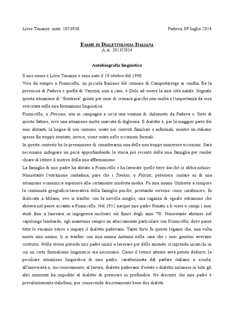 Il ruolo del dialetto catanese nella mia autobiografia linguistica sarà spiegato meglio in seguito Infine, a completare il panorama, meritano una menzione mia zia M e il suo compagno N All’età di quindici anni mi sono trasferita da Gioiosa Marea a Misterbianco, cittadina della provincia di Catania con mia madre e mia zia M (sua sorella). Autobiografia esempio di trasformazione Scrittura Autobiografica La scrittura autobiografica non è una pratica passiva, anzi Ci trasforma perché porta chiarezza mettendoci di fronte a noi stessi e alla vita Lua libera università autobiografia Il Festival Scrittura Autobiografica. Si può lavorare molto con la fantasia, ad esempio, se si vuole aiutare a realizzare l’autobiografia di un bambino come compitino a scuola La vita vista da un bambino, infatti, è tutta un’altra cosa Stessa cosa se ti stai chiedendo come scrivere un’autobiografia scuola media Autobiografia libri come si scrivono.