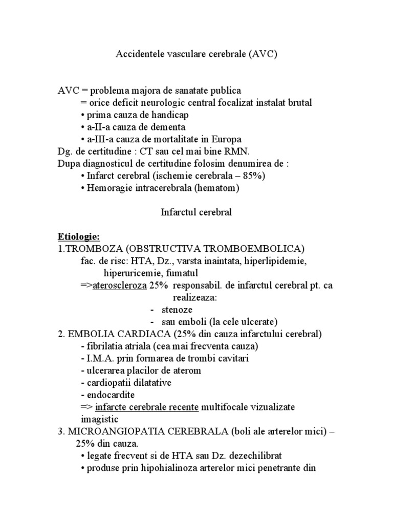 • determinarea precisă a regiunii creierului care deține o funcție afectată, ca gândirea, vorbirea, mișcarea, maparea creierului etc;. RMN cerebral Este indicat pentru a analiza sănătatea creierului normal, afectat sau lezat, analiza funcționării normale Este recomandat pentru • examinarea anatomiei creierului;. Accidentul vascular cerebral se produce atunci când fluxul sangvin către creier este slab sau întrerupt, iar acest lucru duce la moartea celulelor prin privarea de oxigen Cauze AVC este o urgență medicalăEl constituie debutul unui deficit neurologic, datorat unei boli cerebrovasculare Principalul factor de risc al accidentului vascular cerebral este hipertensiunea arterială;.