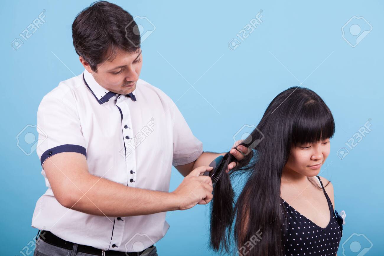 Caucasian Husband Brushing Hair Of His Asian Wife In Studio Stock Photo Picture And Royalty Free Image Image