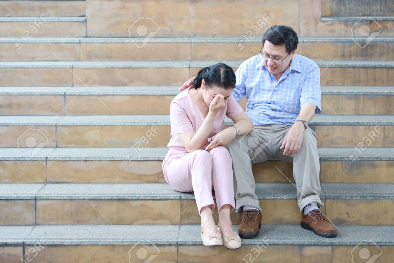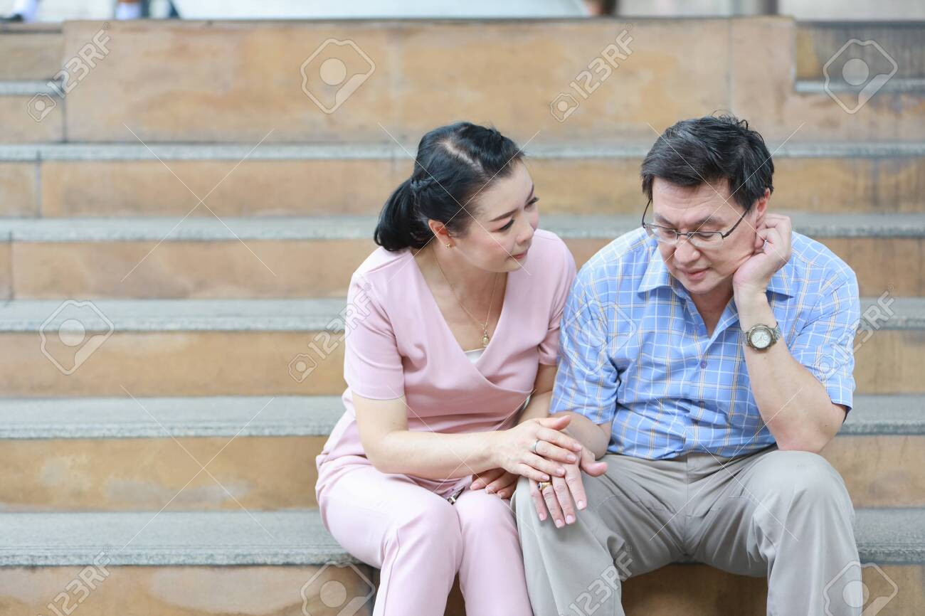 Elderly Asian Husband Is Comforting Elder Asian Wife And Put Stock Photo Picture And Royalty Free Image Image