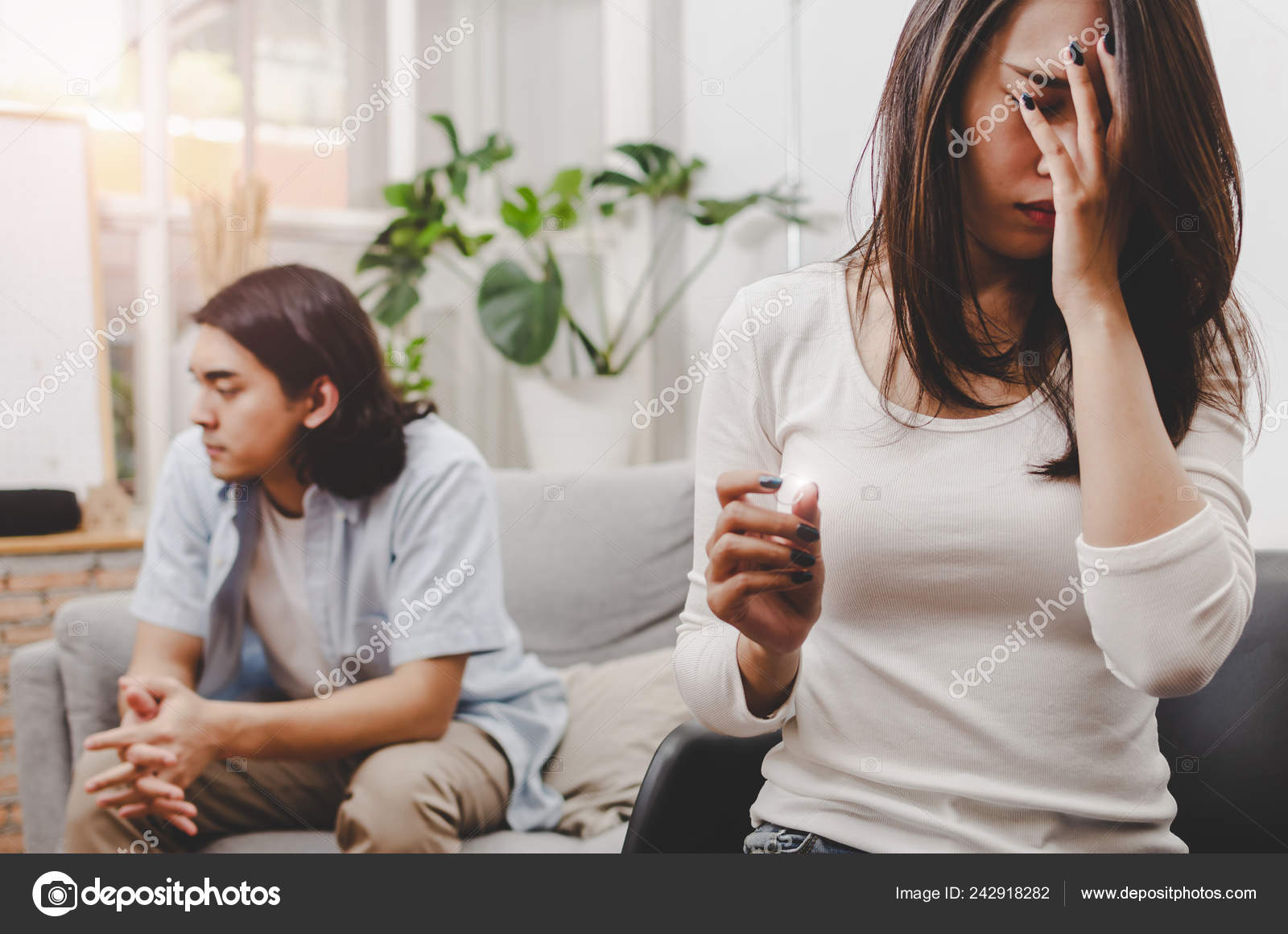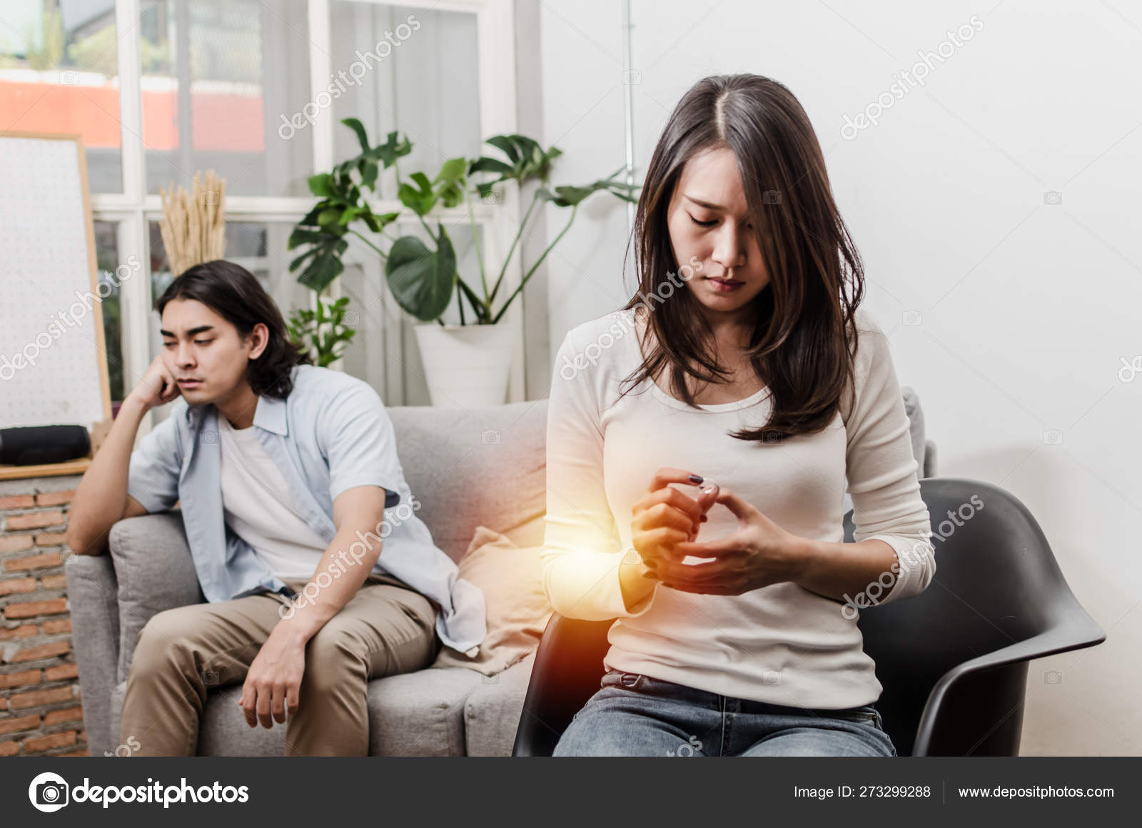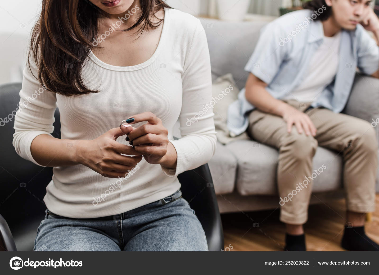 Sadness Young Asian Wife Crying And Looking At Her Ring Sitting On Sofa After Fight With Husband Behind Her In House Interior Together Love Divorce Couple Family Issues And Relationship Concept Stock