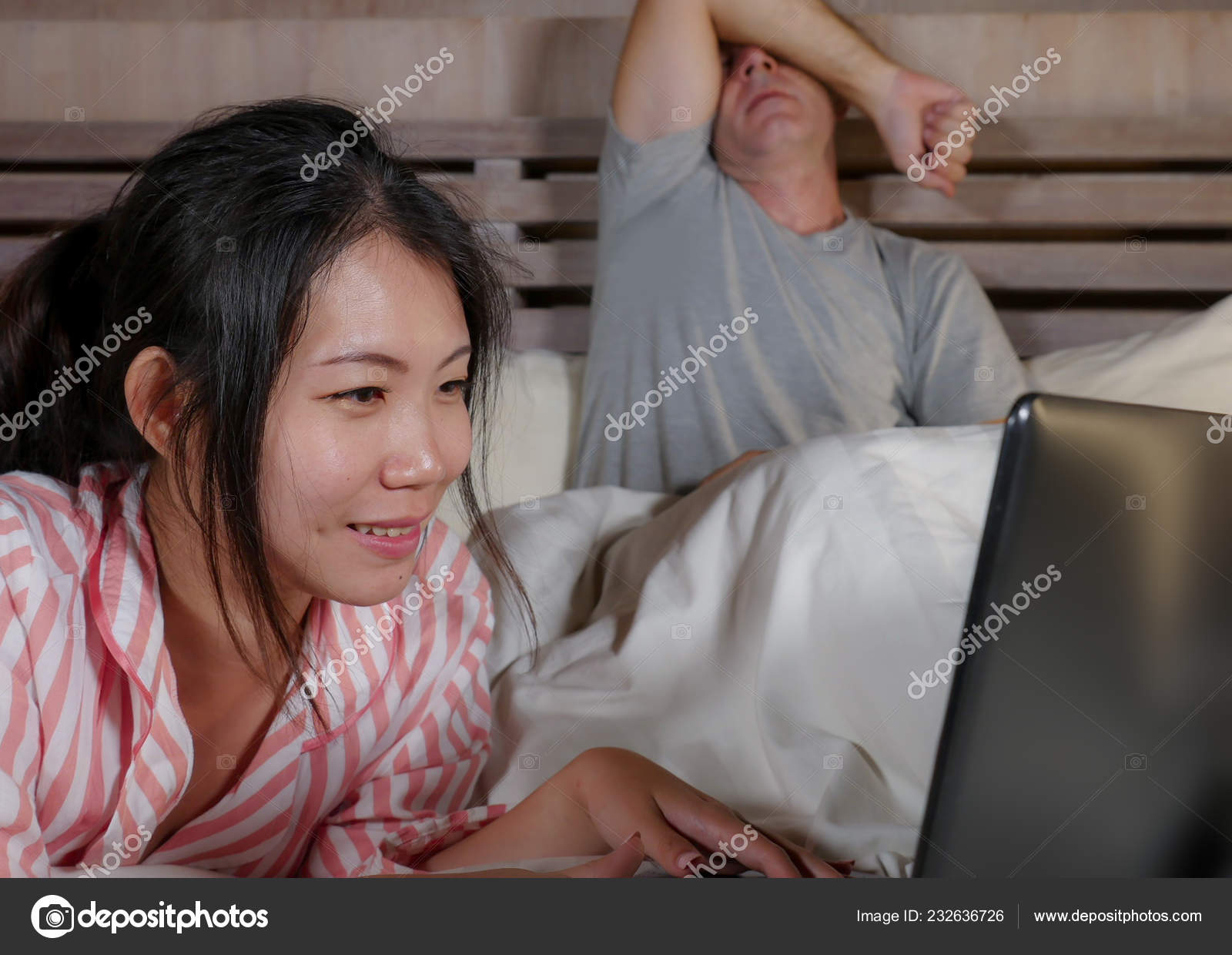 Frustrated Husband Moody In Bed Ignored By His Workaholic Asian Wife Or Internet Social Media Addict Girlfriend Using Laptop In Stock Photo Image Of Ethnicity Caucasian