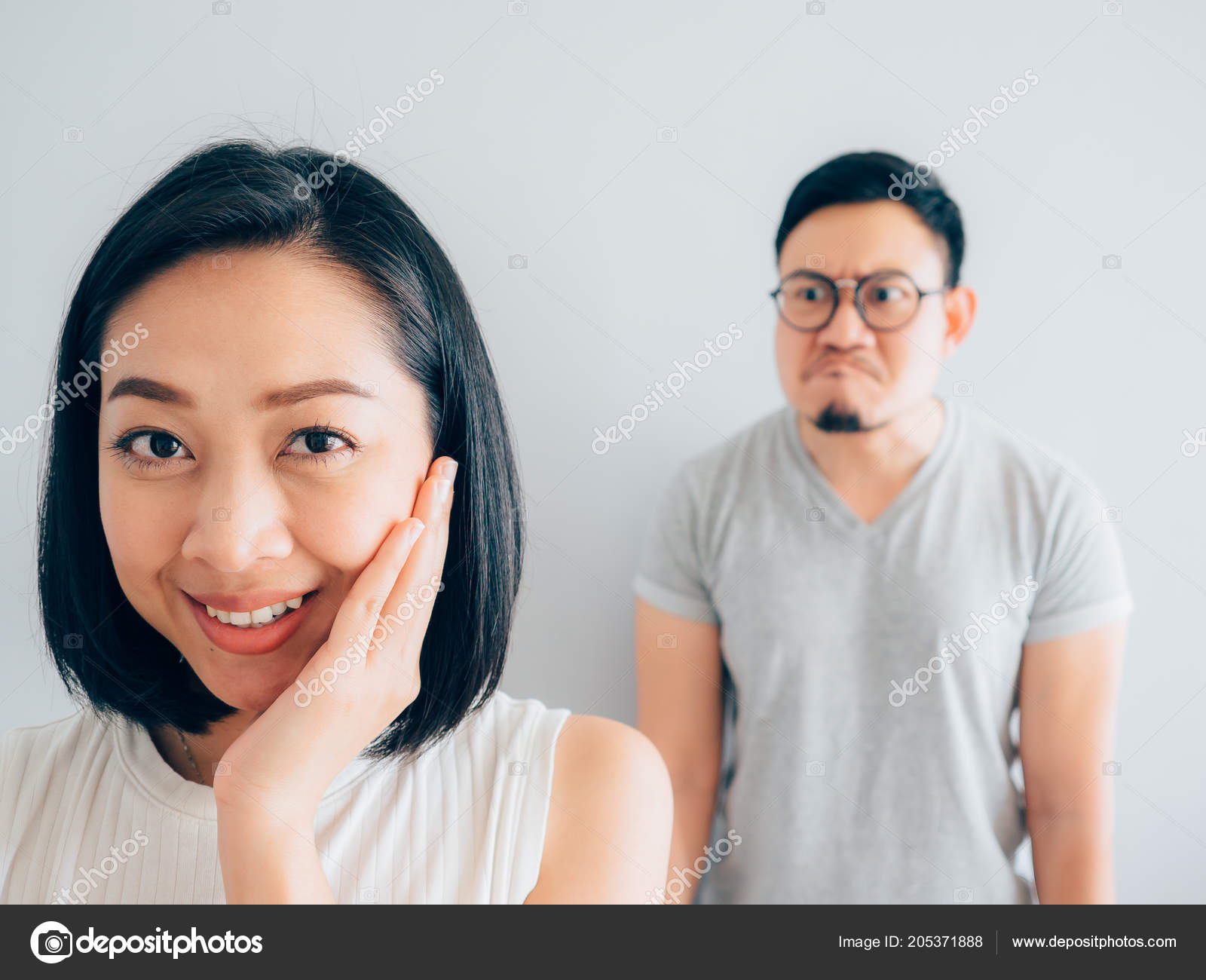 Photo Asian Wife Happy Tricky Asian Wife Angry Loser Husband Stock Photo C Sevendeman