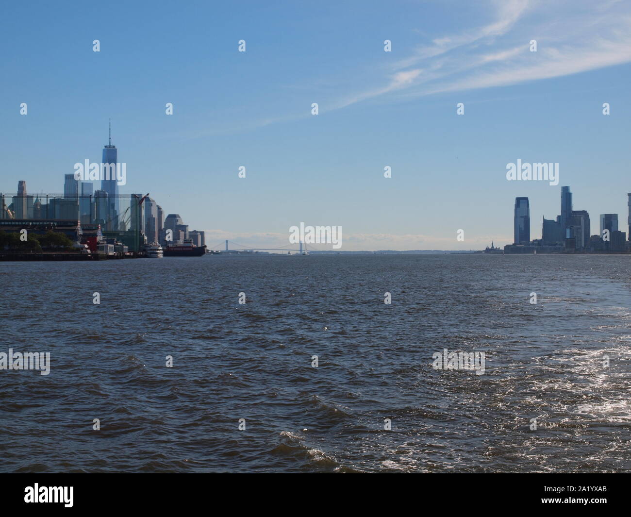 New York Skyline Della Citta E Del Porto Di New York Guardando Al Ponte Verrazzano In Ingresso Al Porto Sulla Destra E Il Jersey City Nj Skyline Foto Stock Alamy