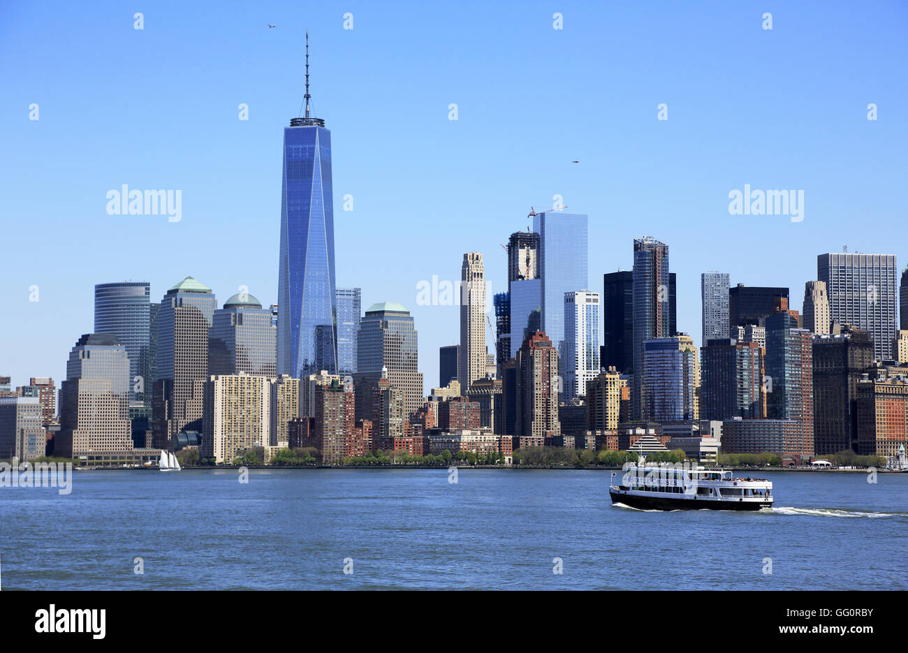Nave Traghetto Nel Porto Di New York Acqua Con Liberta La Torre E La Skyline Di Manhattan In Background New York City Usa Foto Stock Alamy