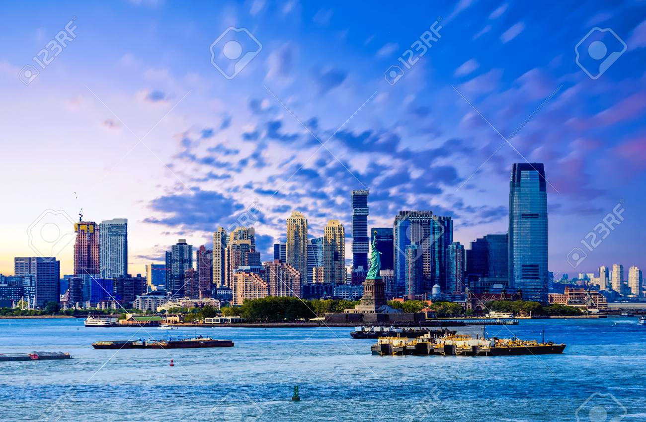Immagini Stock Lo Skyline Di Jersey City New Jersey Dal Porto Di New York Con La Statua Della Liberta In Primo Piano Image