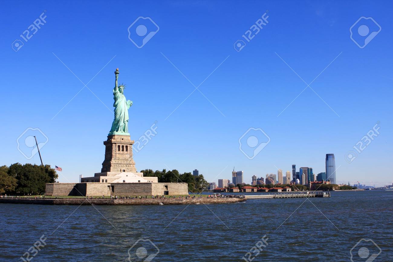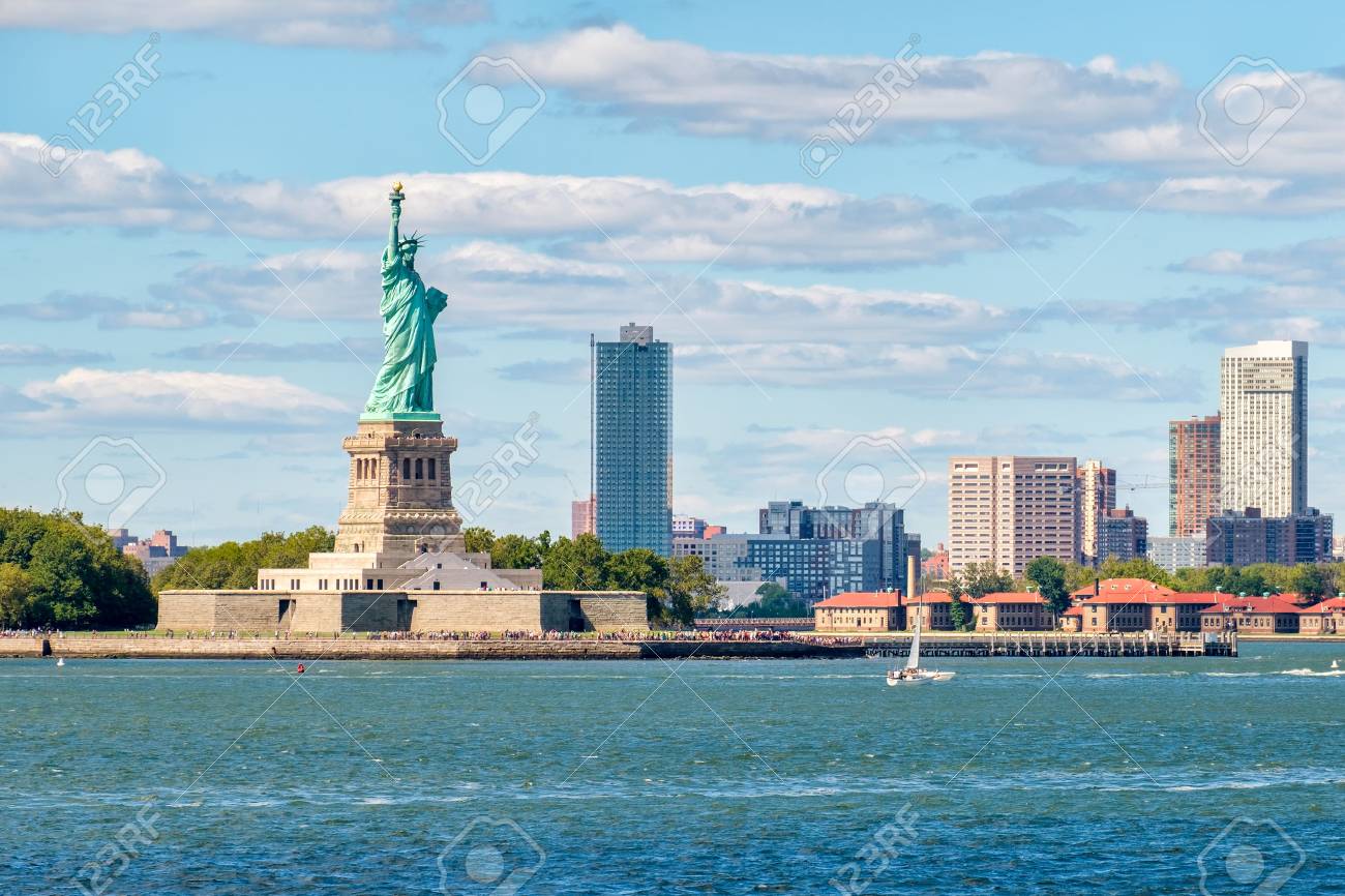 Immagini Stock La Statua Della Liberta Sul Porto Di New York Con Le Costruzioni Della Citta Sullo Sfondo Image