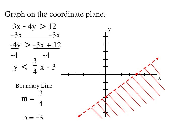 All the numbers on the line satisfy the linear equation y = 2x 2 Graphing linear inequalities is similar to graphing linear equations, except that the line (called the boundary line for inequalities) may or may not be included in the solution set Plus, a halfplane is included. Graph the linear inequality \(y\leq −4x\) Answer First we graph the boundary line \(y=−4x\) It is in slope–intercept form, with \(m=−4\) and \(b=0\) The inequality is \(≤\) so we draw a solid line Now, we need a test point We can see that the point \((1,0)\) is not on the boundary line Is \((1,0)\) a solution of \(y≤−4x\)?. Linear Inequalities and HalfPlanes Each line plotted on a coordinate graph divides the graph (or plane) into two half‐planes This line is called the boundary line (or bounding line) The graph of a linear inequality is always a half‐plane.
