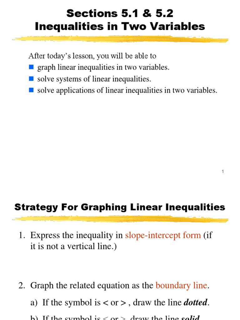 Definition The solution set to a linear inequality is the set of all points (x;y) that satisfy the inequality The graph of the solution set for a linear inequality will be half the Cartesian plane, with the corresponding linear equation’s graph as the boundary line 57 ' TAMU. OAXya 3 OB 2x 3ys 3 OC 3y x. In either case, the dividing line is called the boundary line of each halfplane Chapter 5 Review 51 Inequalities in Two Variables (continued) The graph of a linear inequality is the half plane obtained by following the procedure in this section The variables in an applied problem are often required to be nonnegative.