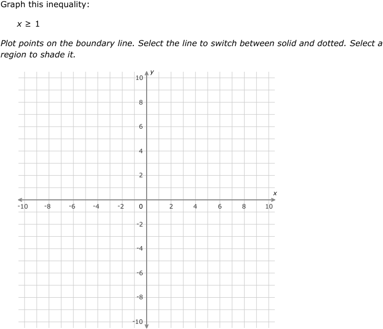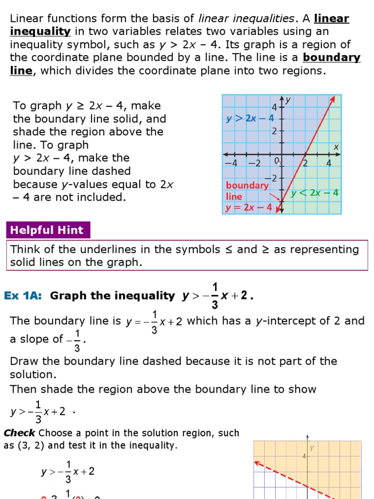 The graph of an inequality in two variables is the set of points that represents all solutions to the inequality A linear inequality divides the coordinate plane into two halves by a boundary line where one half represents the solutions of the inequality The boundary line is dashed for > and < and solid for ≤ and ≥. Using inequalities Graph the following inequalities on the grids below Then check your graphs in the DESMOS y ≥ –x 6 y < 4x – 8 For each item below, write an inequality that contains the given point(s) in its solution Then check your answers in the DESMOS The point (0, 0) and all points on the boundary line y = –2x 1 The point. The shaded area is called the bounded region, and any point within this region satisfies the inequality x≥ 2 Notice also that the line representing the region’s boundary is a solid line;.
