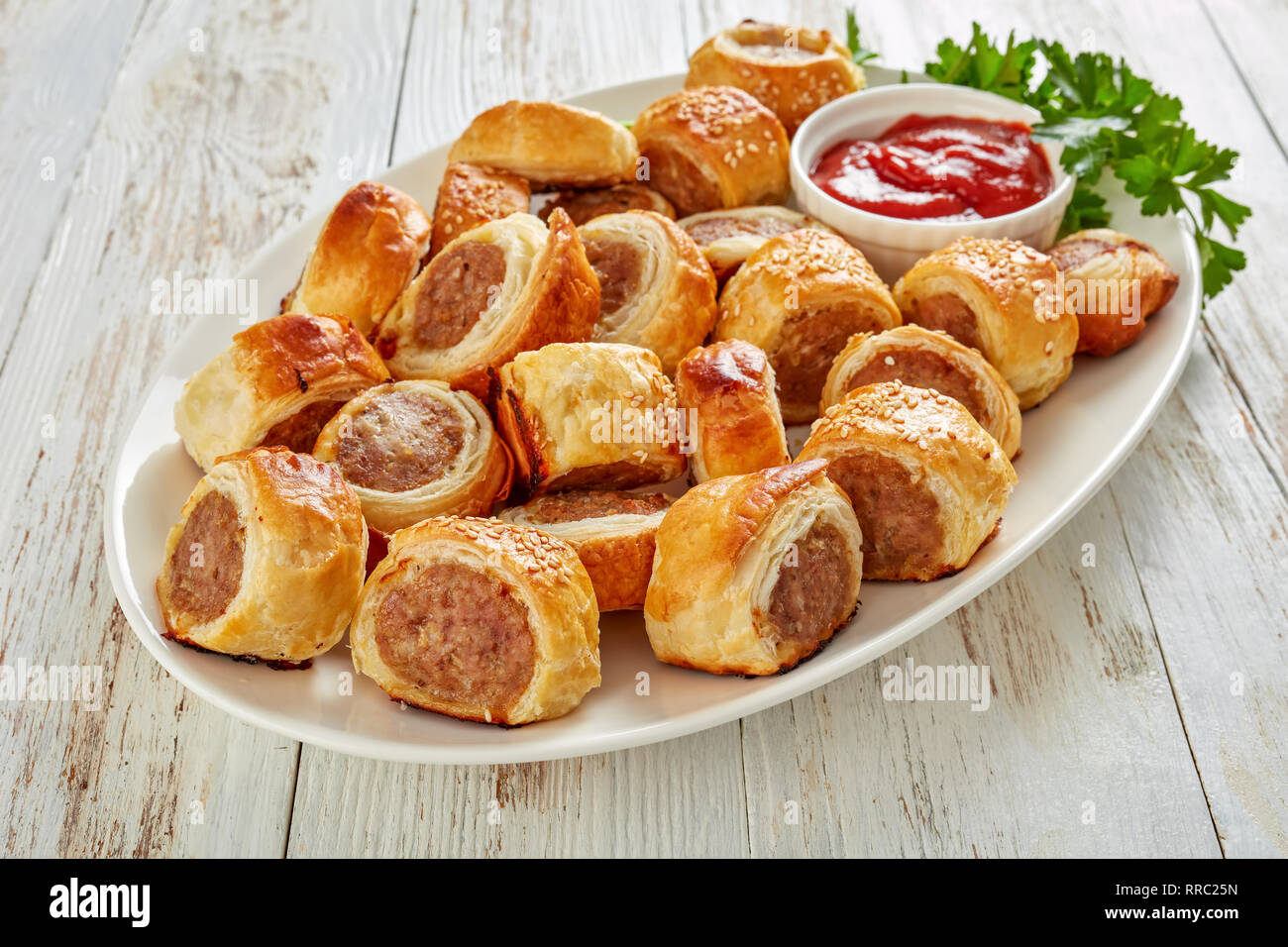 Pane Appena Sfornato Pasta Sfoglia Salsiccia Panini Con Salsa Di Pomodoro E Prezzemolo Su Una Piastra Bianca Partito Inglese Cibo Vista Orizzontale Dal Di Sopra Close Up Foto Stock Alamy
