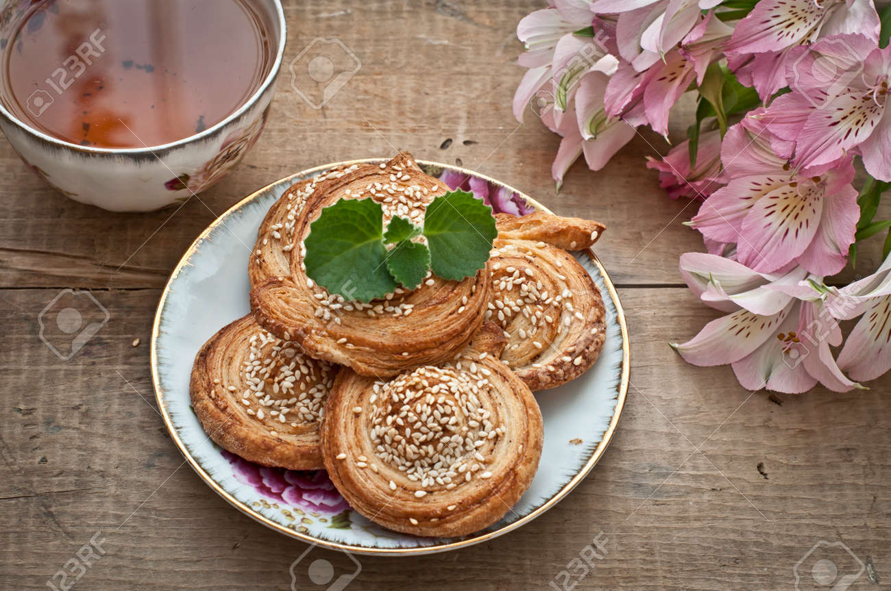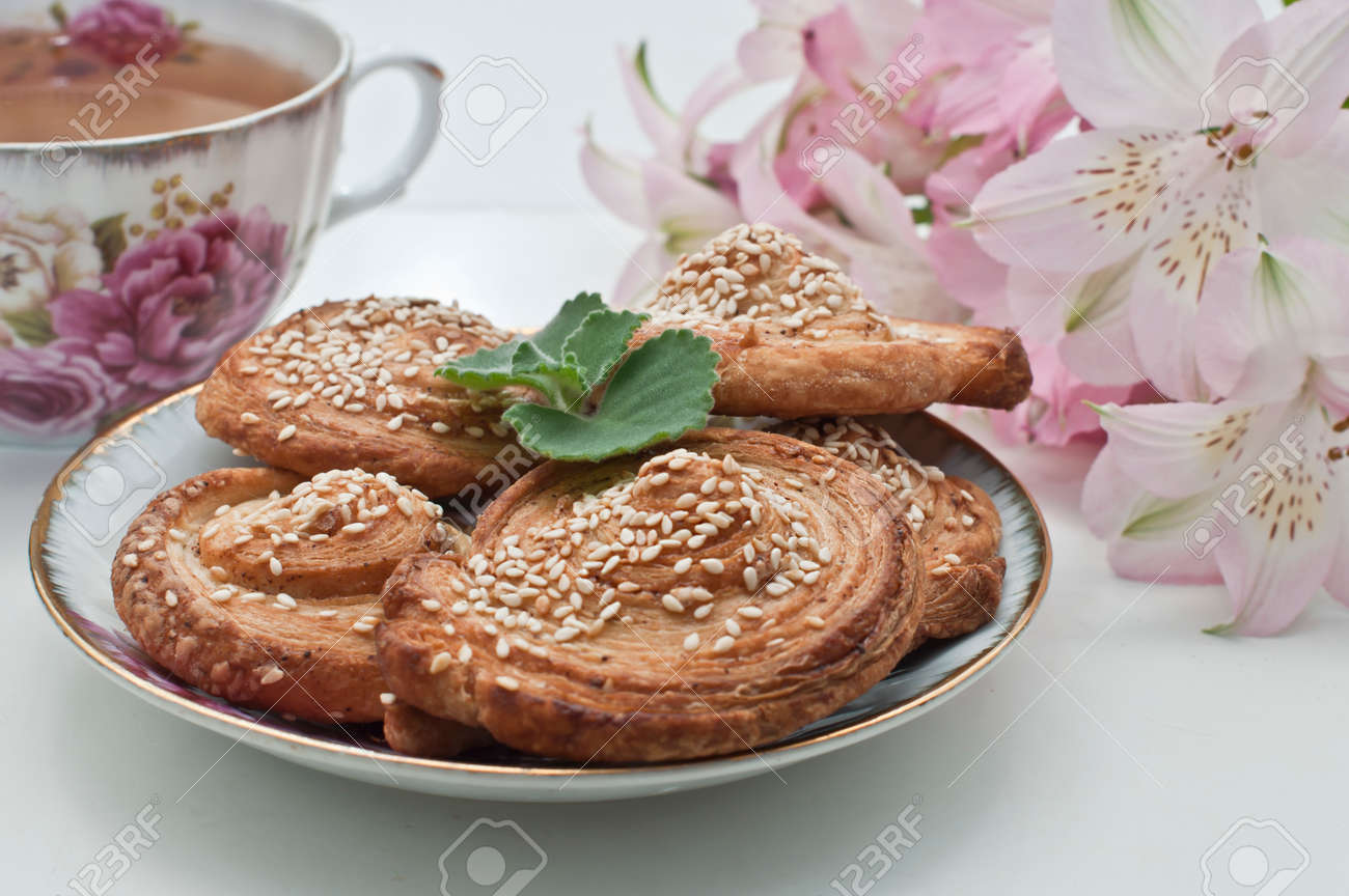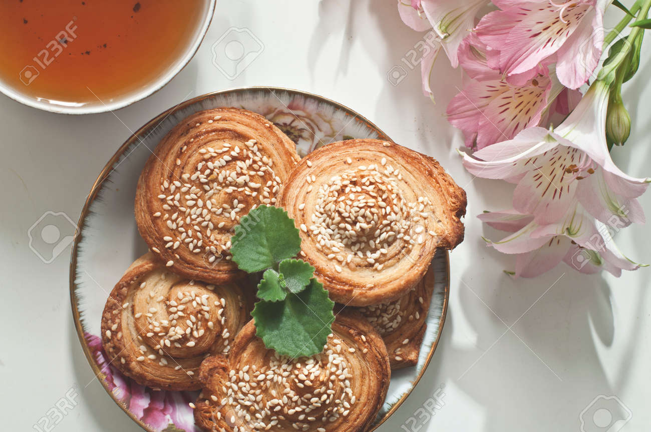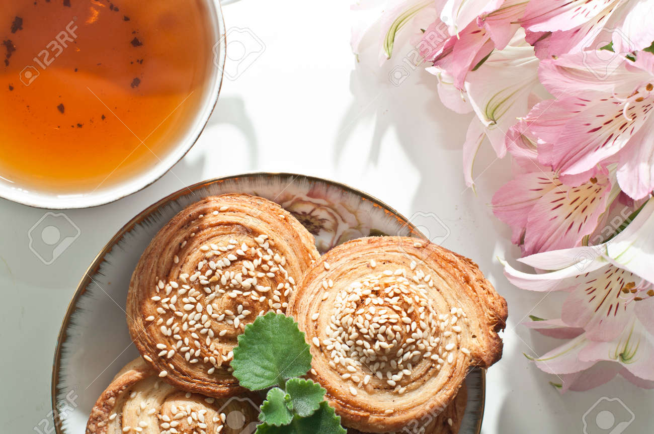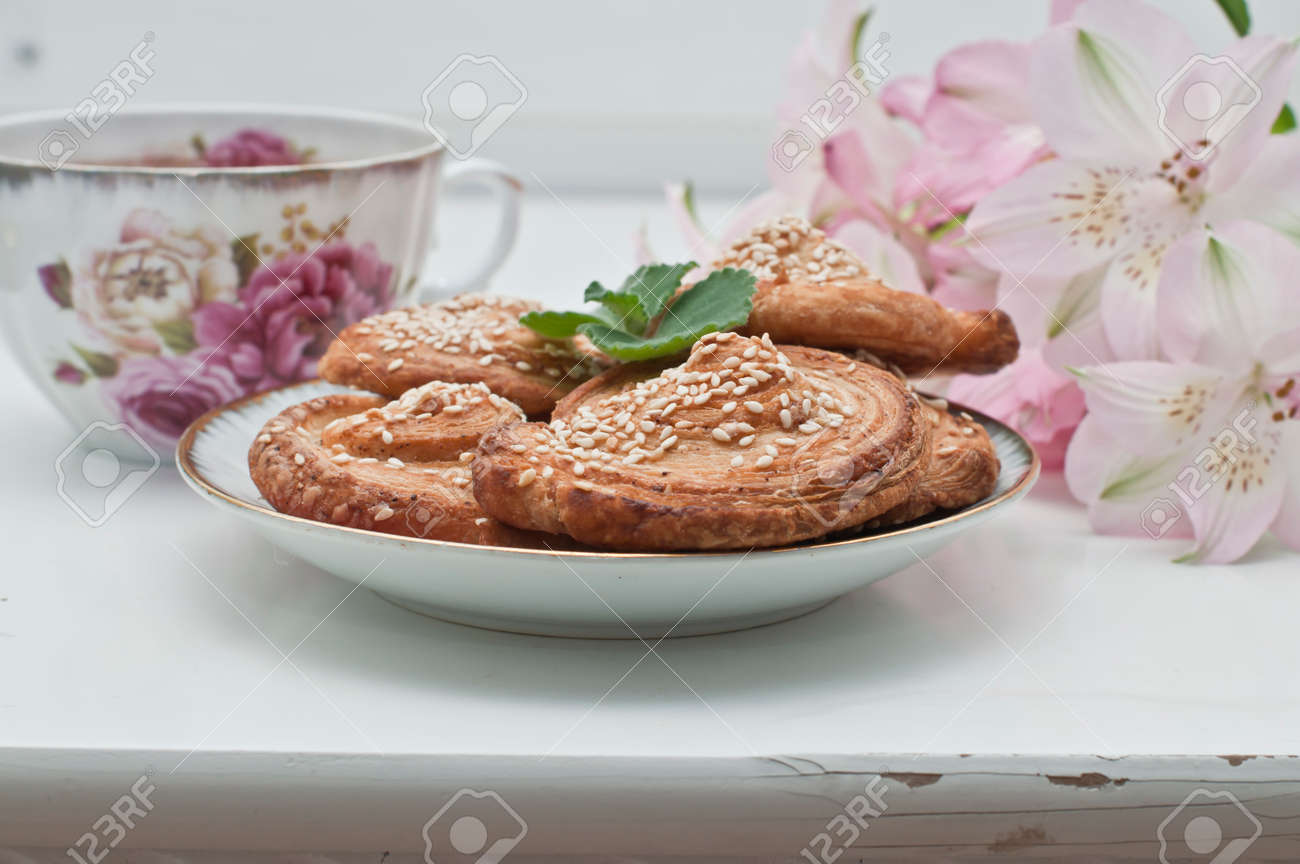 Immagini Stock Panetteria Fatta In Casa Biscotti A Pasta Sfoglia Con Semi Di Sesamo Sul Piatto Te Inglese E Teneri Fiori Bellissimi Image