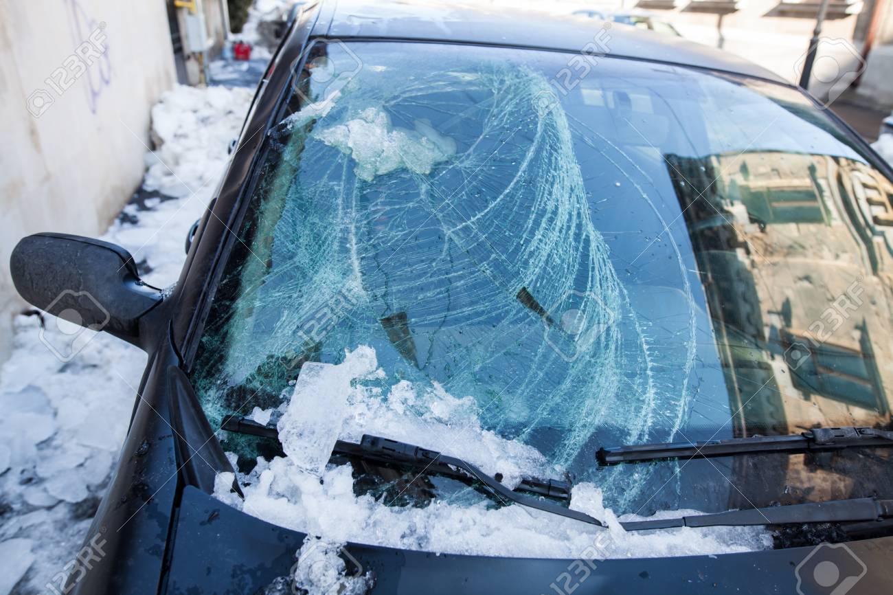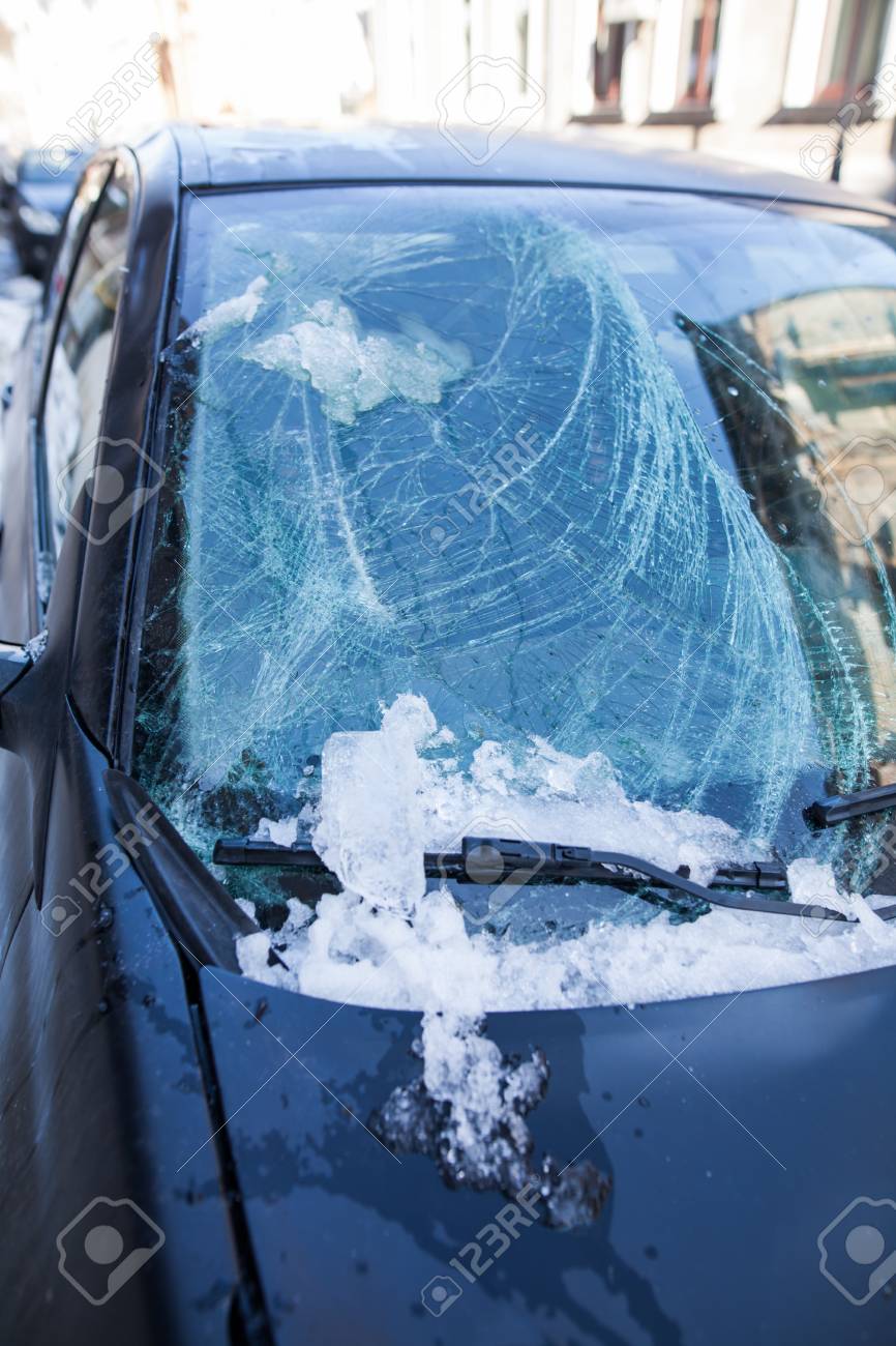 Immagini Stock Immagine Del Parabrezza Rotto Di Un Auto Dopo Che Un Pezzo Di Ghiaccio E Caduto Dal Tetto Di Una Casa Image