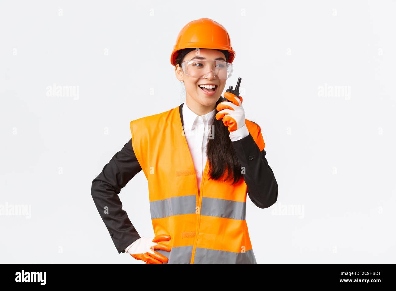 Confident Pleased Asian Female Engineer In Safety Helmet And Uniform Talking With Chief Architect Using Walkie Talkie Satisfied Construction Stock Photo Alamy