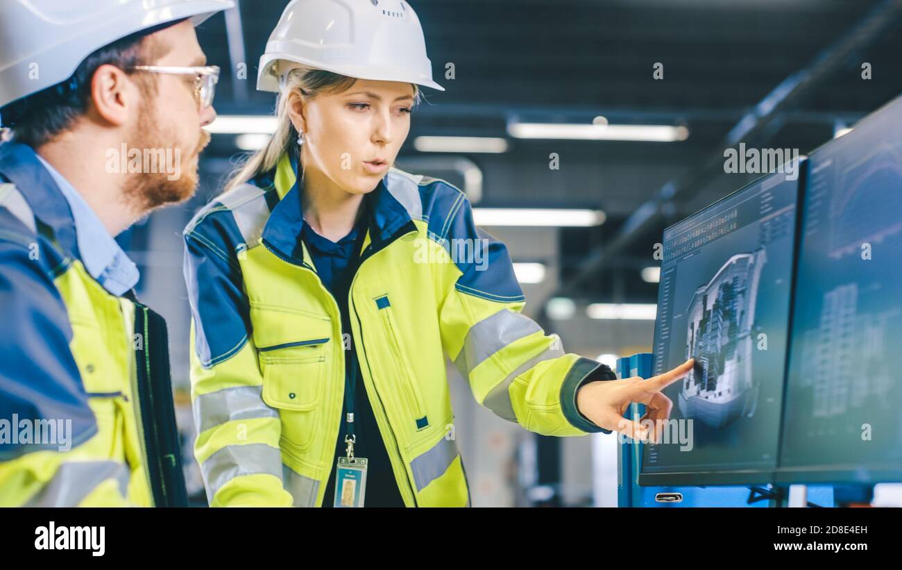 Inside Factory Male Mechanical Engineer And Female Chief Engineer Work Together On The Personal Computer They Discuss Details Of The 3d Engine Model Stock Photo Alamy
