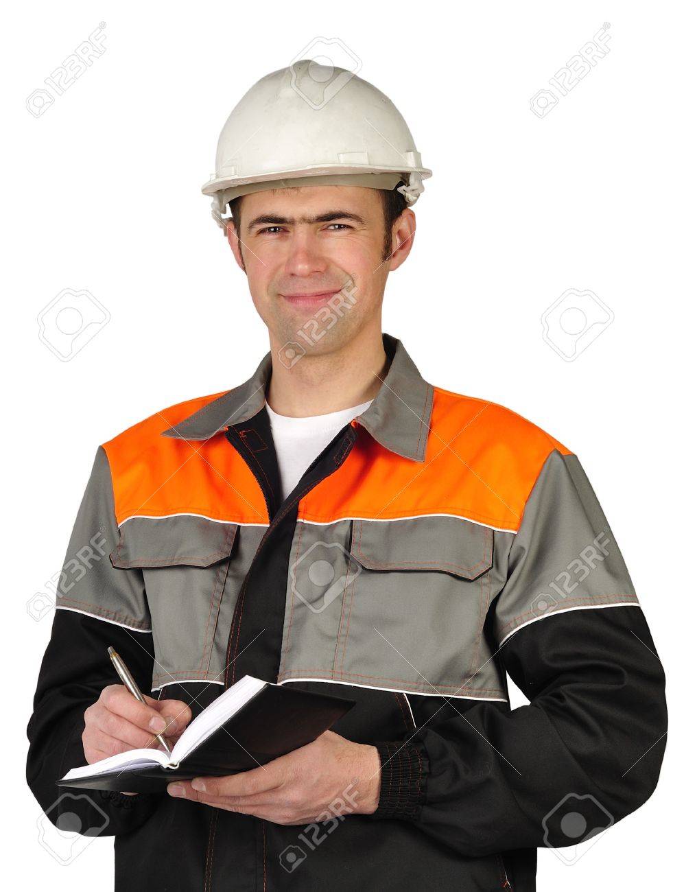 The Chief Engineer In A Helmet Writes In A Notebook On A White Stock Photo Picture And Royalty Free Image Image