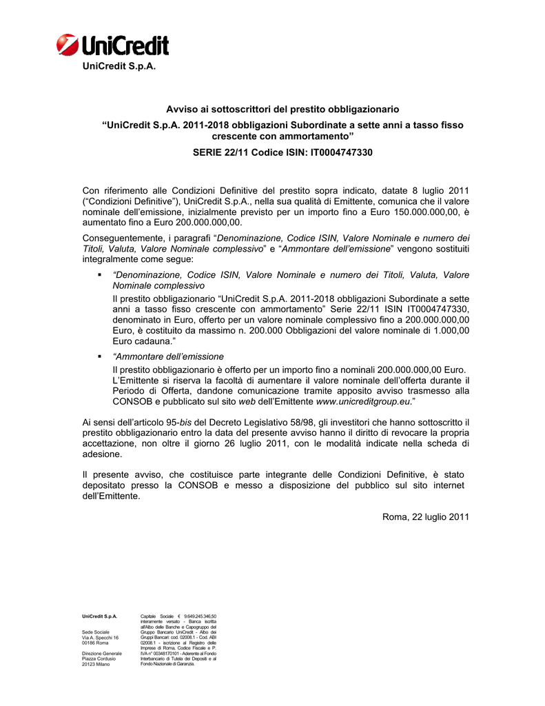 Unicredit Spa 15 22 Serie 01 15 Subordinata