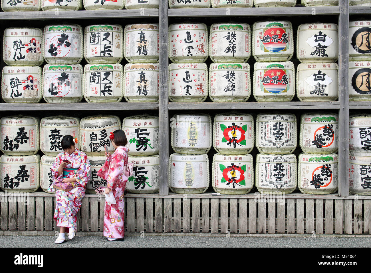 Traduzione Ragazze In Kimono Nella Parte Anteriore Dei Tamburi O Barili Di Sake Giapponese Bevande Alcoliche Al Santuario Tsurugaoka Prese A Kamakura Febbraio 18 Foto Stock Alamy
