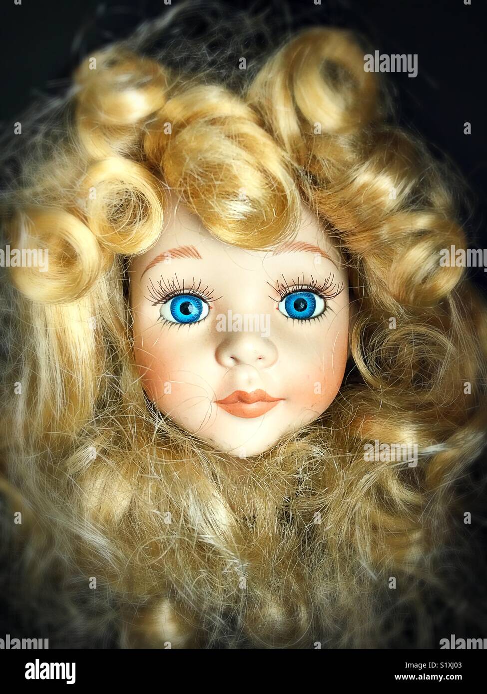 Testa Di Bambola Con I Riccioli Biondi E Gli Occhi Blu Foto Stock Alamy