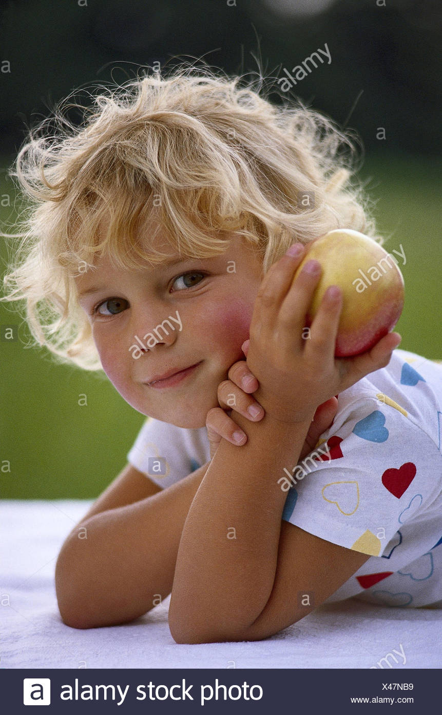 Bambino Ragazza Bionda Bracci Di Aggiungere Il Supporto Apple Ritratto Al Di Fuori Estate Infanzia Neonati