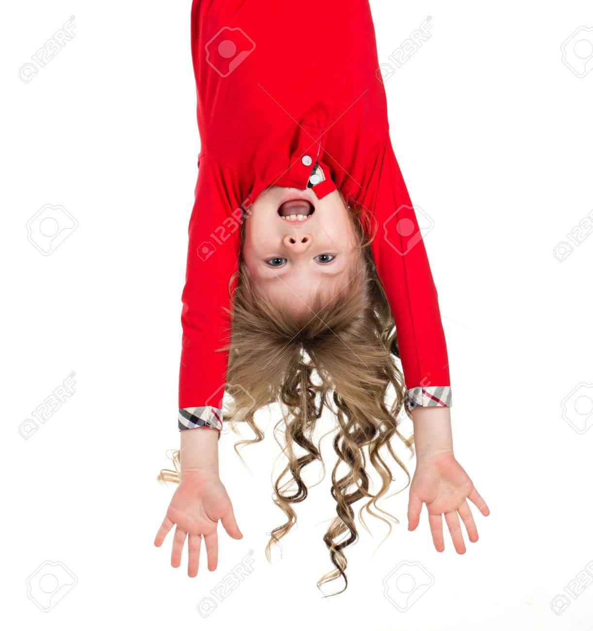 Immagini Stock Piccola Bella Ragazza Con Lunghi Riccioli Biondi Appeso A Testa In Giu Isolato Su Bianco Image