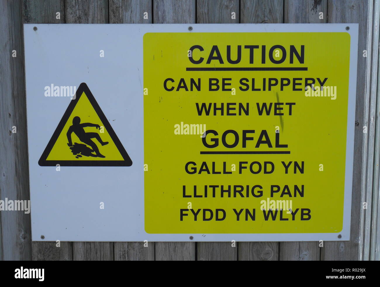 Sign In Inglese E Gallese Di Segnalazione Di Un Pavimento Scivoloso Baia Di Cardiff Cardiff Galles Del Sud Regno Unito Foto Stock Alamy
