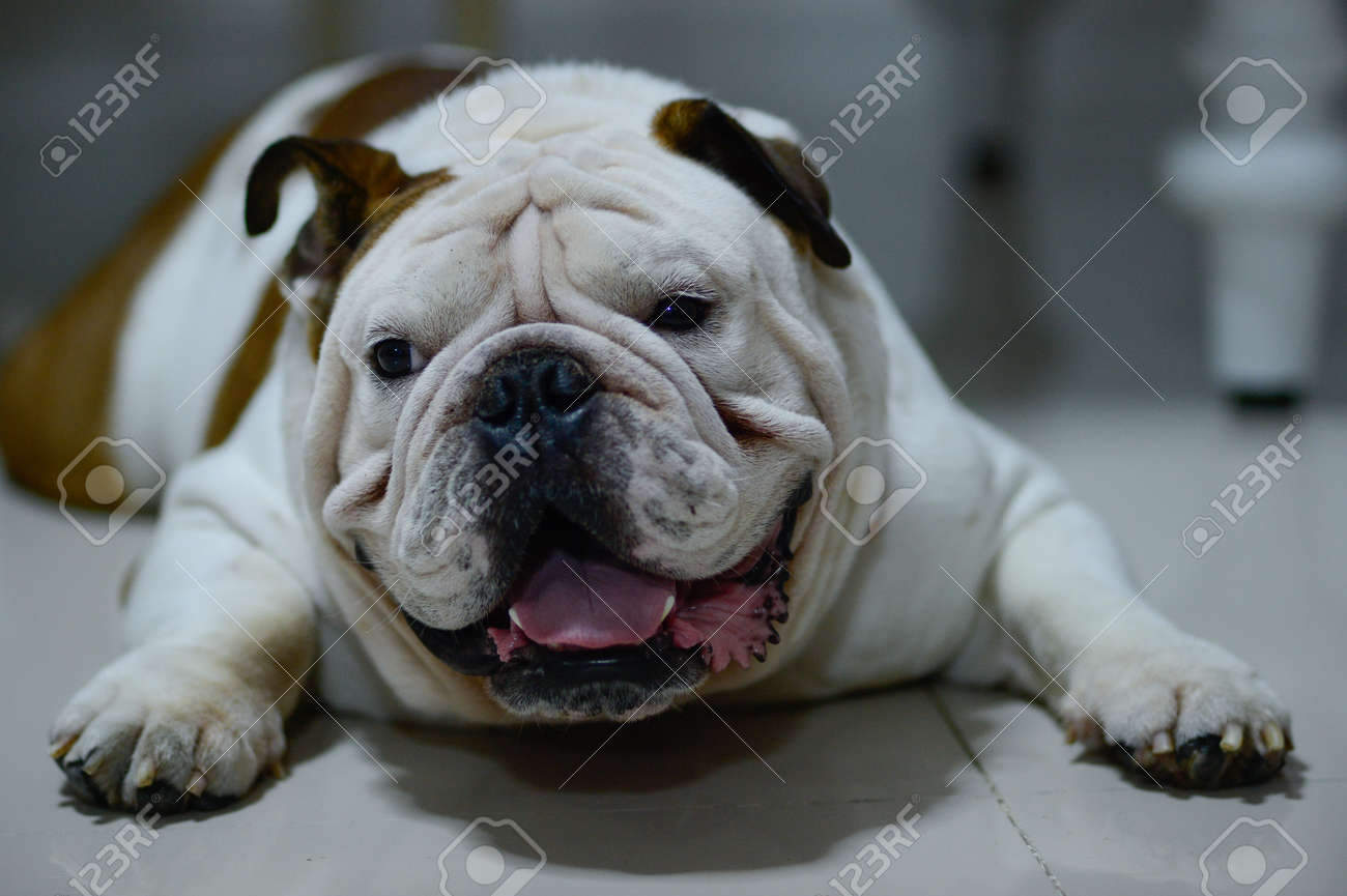 Immagini Stock Il Bulldog Inglese Dorme Sul Pavimento E Un Cane Assonnato E Grasso Image