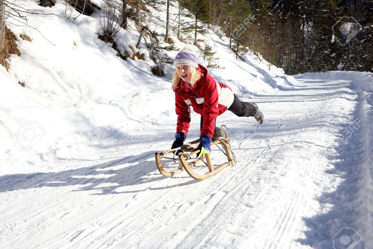 Fille Faire De La Luge Sur Une Journee Ensoleillee D Hiver Banque D Images Et Photos Libres De Droits Image