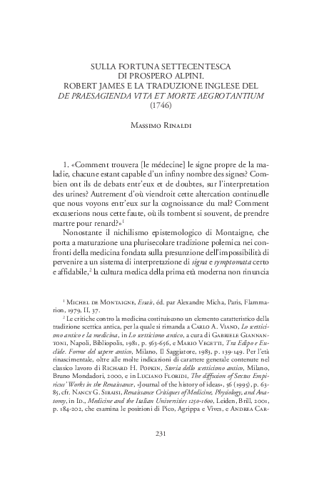 Pdf Sulla Fortuna Settecentesca Di Prospero Alpini Robert James E La Traduzione Inglese Del De Praesagienda Vita Et Morte Aegrotantium 1746 In Alpiniana Studi E Testi A Cura Di Giuseppe Ongaro Treviso