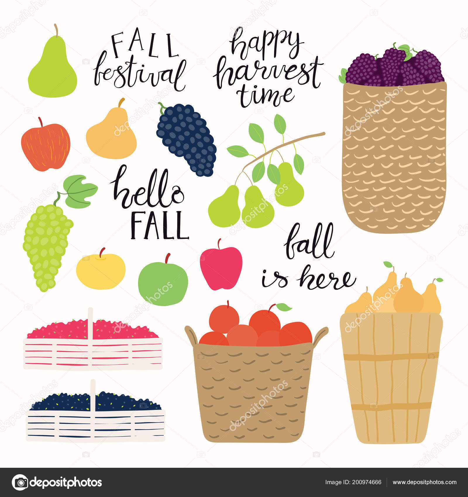 Hand Drawn Autumn Harvest Set Baskets Fruits Lettering Quotes Vector Stock Vector C Maria Skrigan