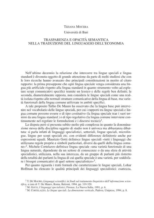 Trasparenza E Opacita Semantica Nella Traduzione Del Linguaggio Dell Economia Mocera Tiziana Longo