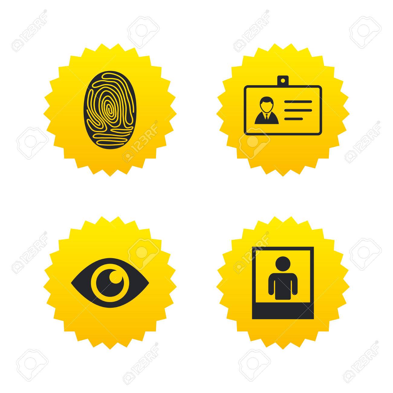 Vettoriale Icone Di Badge Identificativo Di Identita Simboli Di Occhi E Impronte Digitali Segni Di Autenticazione Cornice Per Foto Con Persona Umana Etichette Di Stelle Gialle Con Icone Piatte Vettore Image