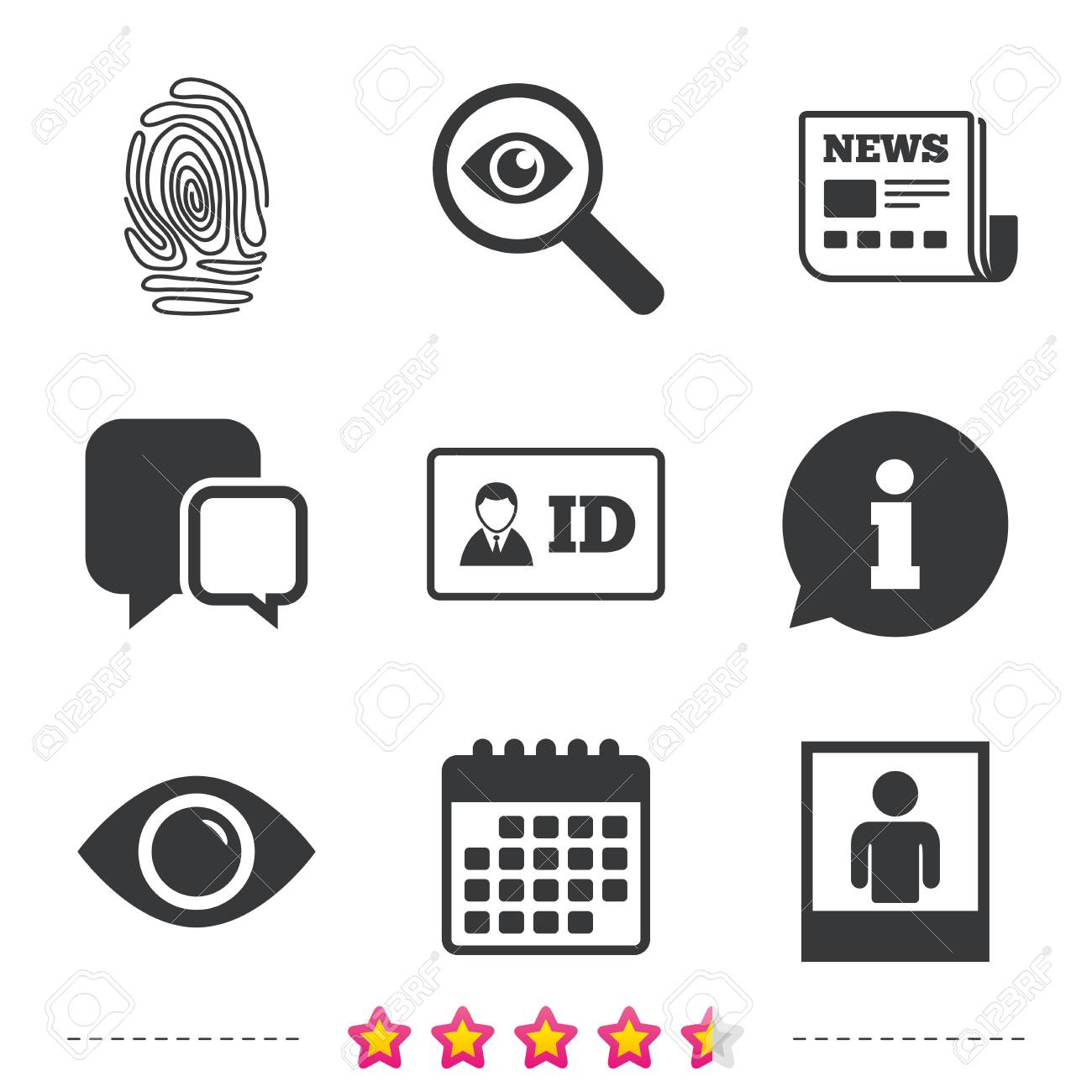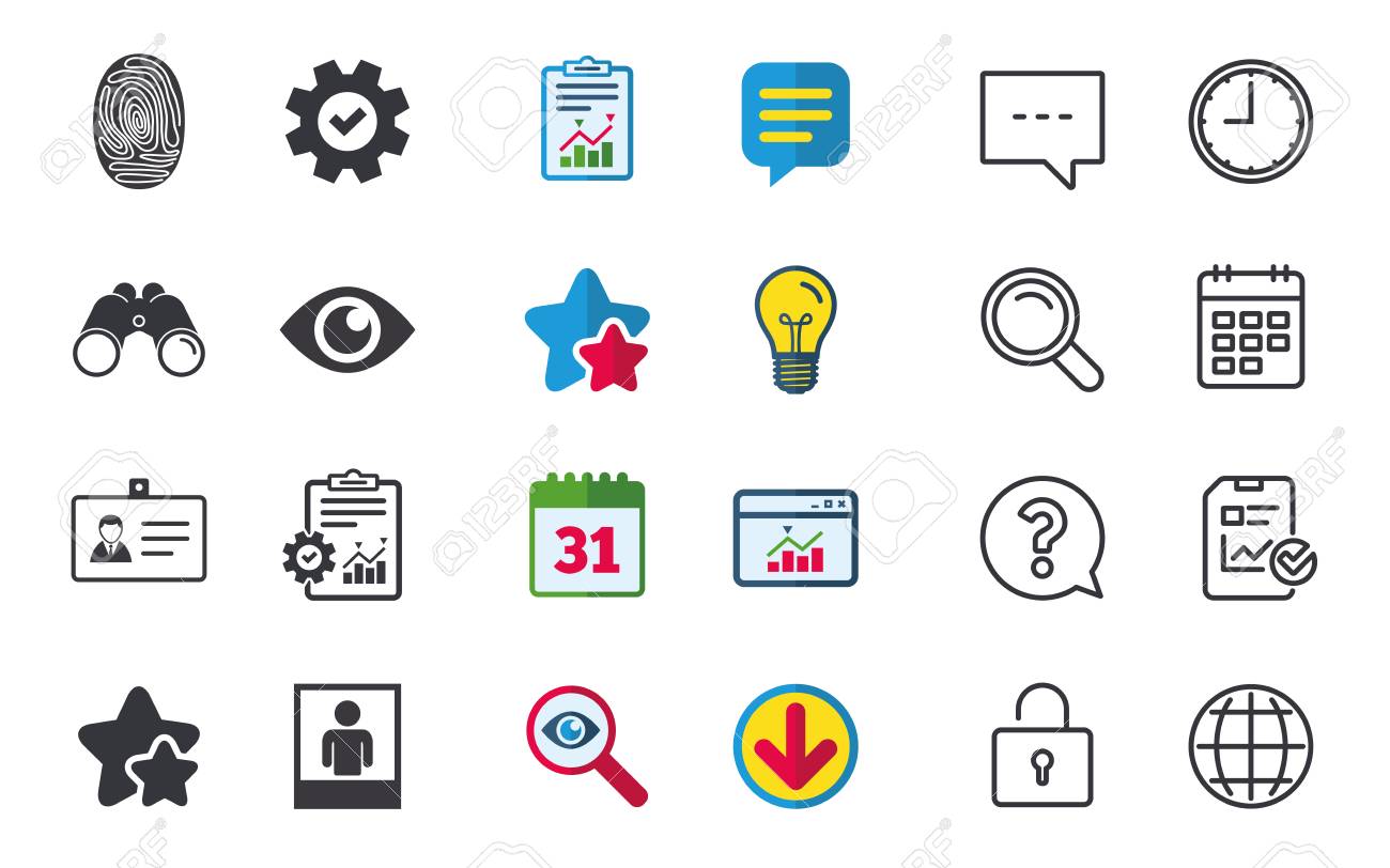 Vettoriale Icone Di Badge Identificativo Di Identita Simboli Di Occhi E Impronte Digitali Segni Di Autenticazione Cornice Per Foto Con Persona Umana Chat Segnalazioni E Segni Di Calendario Stelle Statistiche E