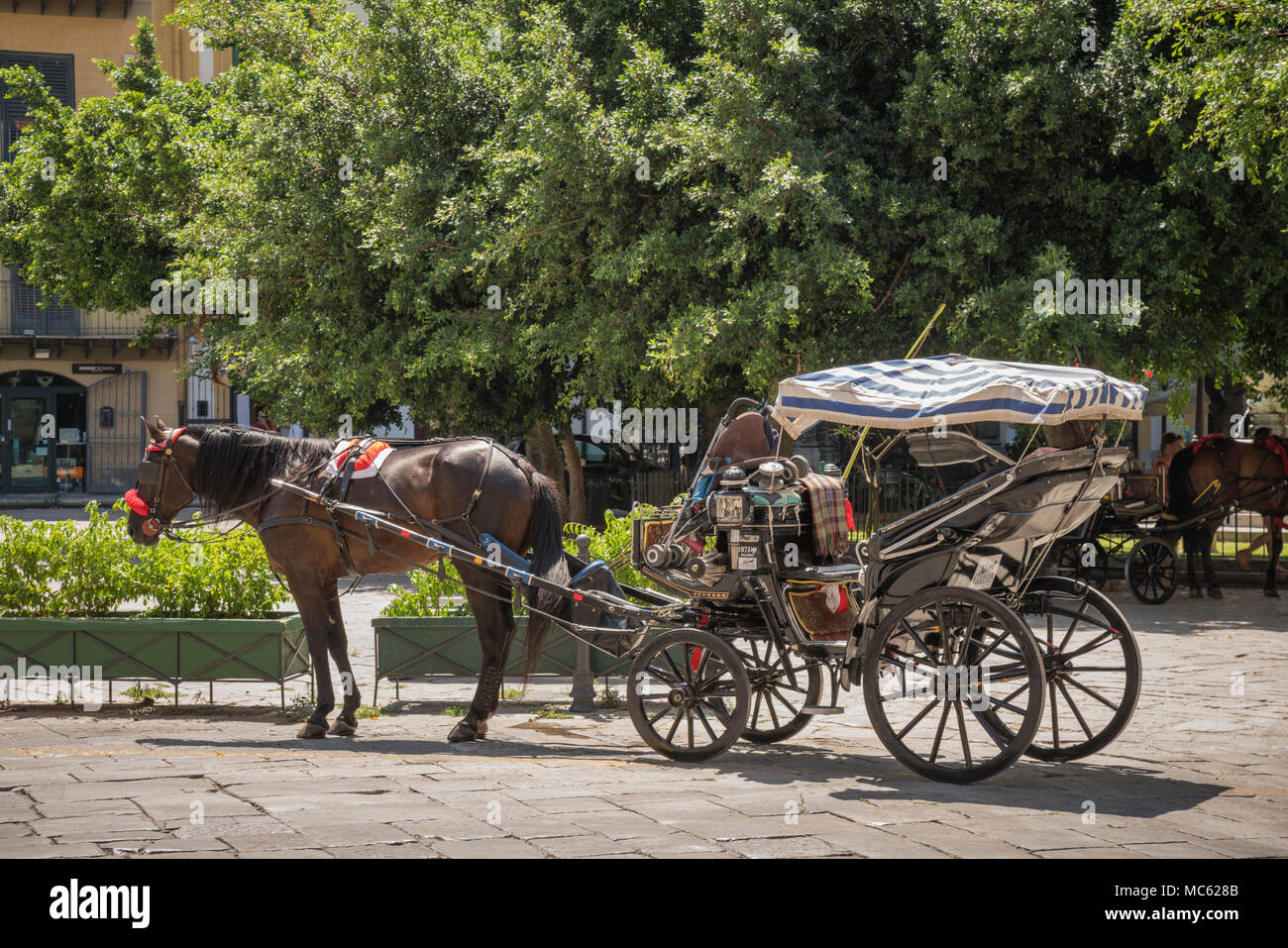 Carro Trainato Da Cavalli Piazza Marina Palermo Sicilia Italia Parcheggiata Vicino Al Porto In Attesa Per I Turisti Provenienti Da Navi Da Crociera A Fare Un Giro Turistico Foto Stock Alamy