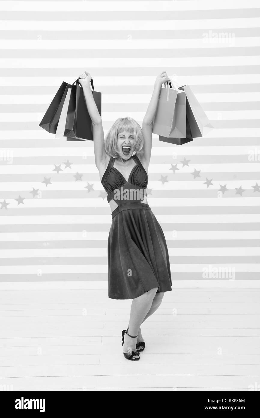 Shopping Online App Happy Girl Godersi Lo Shopping Online Retro Donna Andare A Fare Shopping Con Carrello Completo Risparmi Sugli Acquisti Vintage Donna Casalinga Pronto Foto Stock Alamy