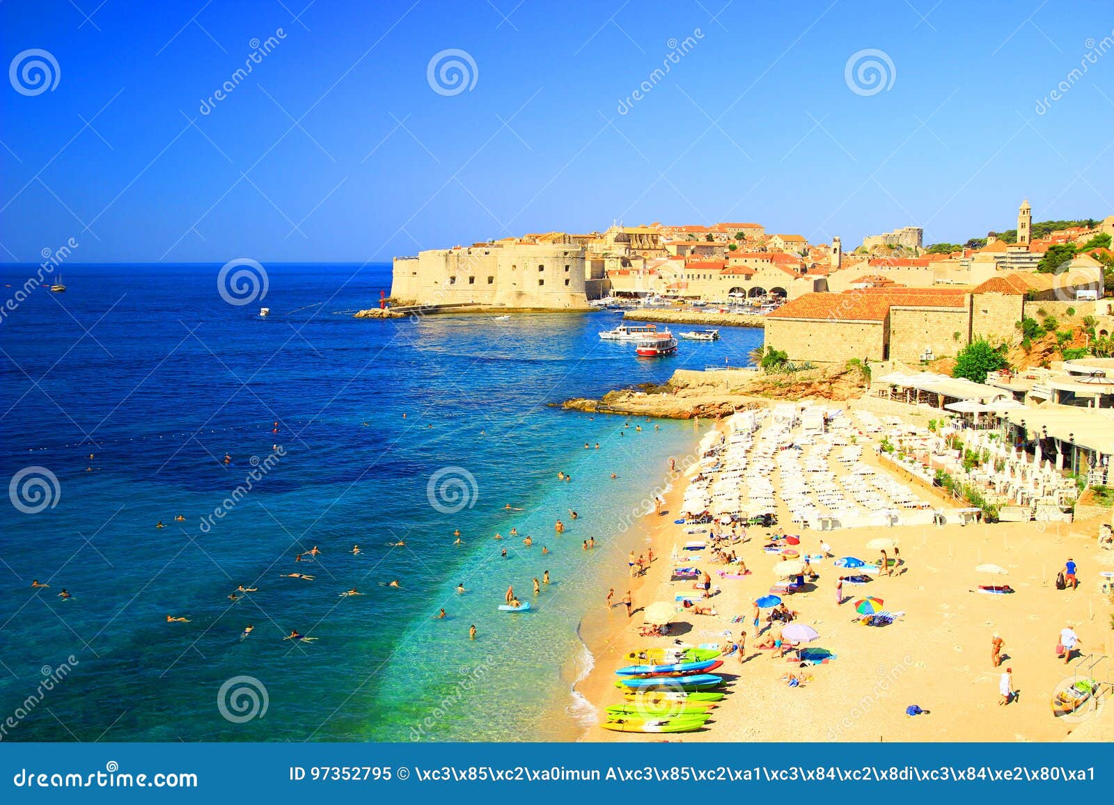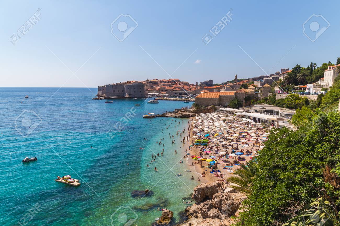 Immagini Stock Dubrovnik Croazia 10 Agosto 16 Una Veduta Della Spiaggia Di Banje Il Mare Adriatico E La Citta Vecchia Di Dubrovnik Durante Il Giorno In Estate Grandi Quantita Di