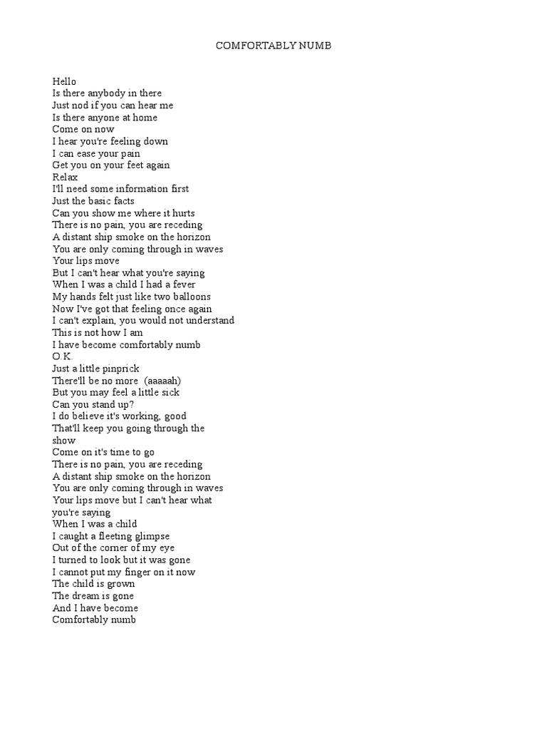 Pink Floyd Testo della canzone Comfortably Numb Hello / Is there anybody in there?. About “Comfortably Numb” Pink’s emotional journey into the past is both interrupted and heightened when his management breaks into the hotel room and has a doctor inject him with a drug that will. Privacy policy news music.
