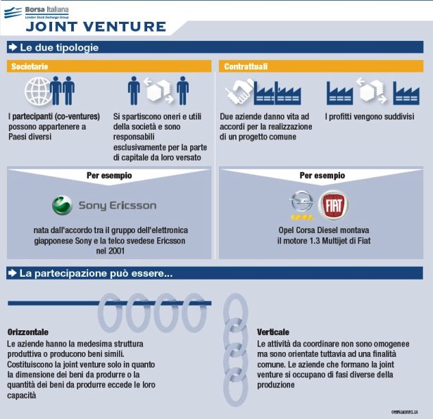 I primi studi sul common rail, il “collettore comune” che ha rivoluzionato il mondo del motore, vengono condotti negli anni '80'90 e vedono protagonisti Magneti Marelli, azienda milanese che produce batterie, centraline e sistemi di accensione, nata nel 1919 come joint venture dalla Fiat;. A tale sostanziale “atipicità” del fenomeno “joint venture” non si oppone il fatto che in certe nazioni, ed in particolar modo nei Paesi in Via di Sviluppo, siano state introdotte delle specifiche normative in tema di joint venture, intese in tale sede come una collaborazione, il più delle volte su base societaria, tra un socio locale. Il gruppo Triboo e International Luxury Group hanno firmato un accordo per una joint venture a Dubai La partnership con il player, leader nella distribuzione e produzione dei beni di lusso in Medio Oriente e Africa, va a rafforzare la presenza internazionale di Triboo, gruppo che controlla Wall Street Italia tramite l’editore Brown Editore, attivo nel settore eCommerce e Advertising.