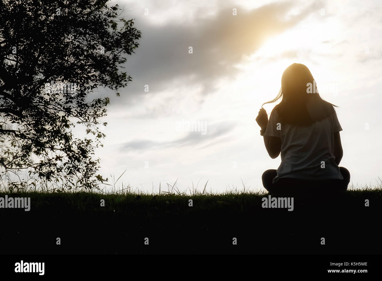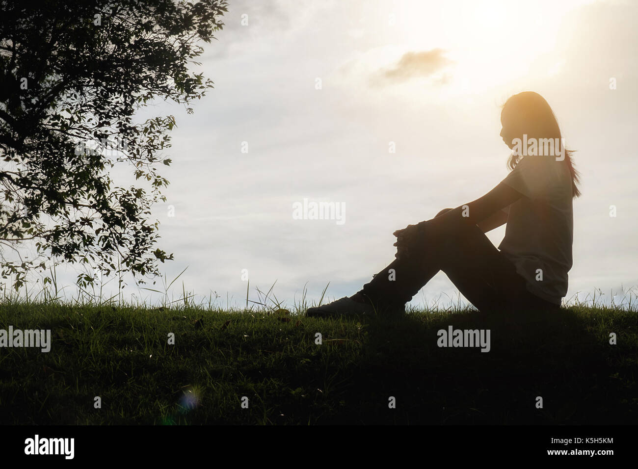 Triste E Depresso Donna Seduta Da Sola In Campo Durante Il Bellissimo Tramonto Con Lo Sfondo Del Parco Messa A Fuoco Selettiva Foto Stock Alamy